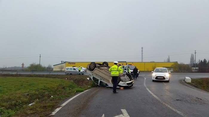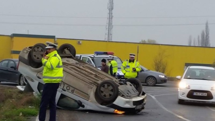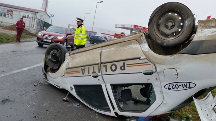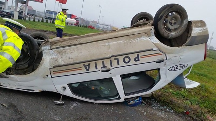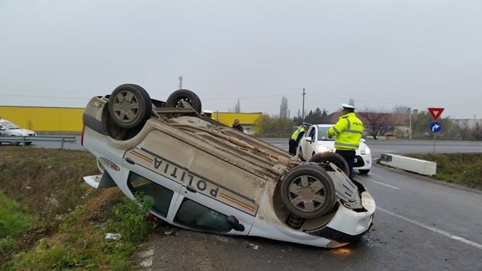 TIMISOARA. Accident spectaculos in aceasta dupa amiaza, aproape de Timisoara. O masina de politie a ajuns cu rotile in sus, dupa ce soferul a calcat prea tare pedala de acceleratie. La fata locului au ajuns imediat colegii politistului implicat in accident, ca sa vada ce s-a intamplat cu exactitate.