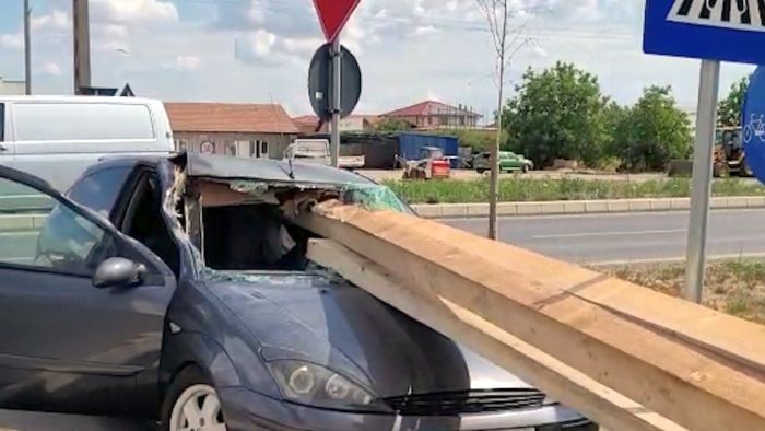 “Un barbat de 35 de ani conducea o autoutilitara ce transporta cherestea în localitatea Mosnita Noua dinspre Timisoara inspre localitatea Albina, iar la efectuarea unui viraj la dreapta, marfa nefiind asigurata corespunzator s-a desprins din autovehicul si cateva bucati au pătruns prin parbrizul unui autoturism care circula in spatele autoutilitarei, condus de un barbat de 27 de ani.