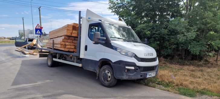 Totul s-a intamplat la Mosnita Noua, pe sensul de mers spre Albina. Autoutilitara a virat la dreapta pe o strada secundara si, fiind supraincarcata si neasigurata corespunzator, a intrat in balans, iar chingile cu care era legata marfa s-au rupt. Grinzile de lemn au alunecat direct in masina aflata in spate, au spart parbrizul si au intrat in autoturism.
