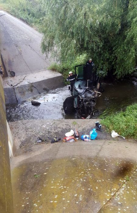 Pompierii au intervenit pentru recuperarea victimelor si pentru a scoate din albie masina facuta praf.