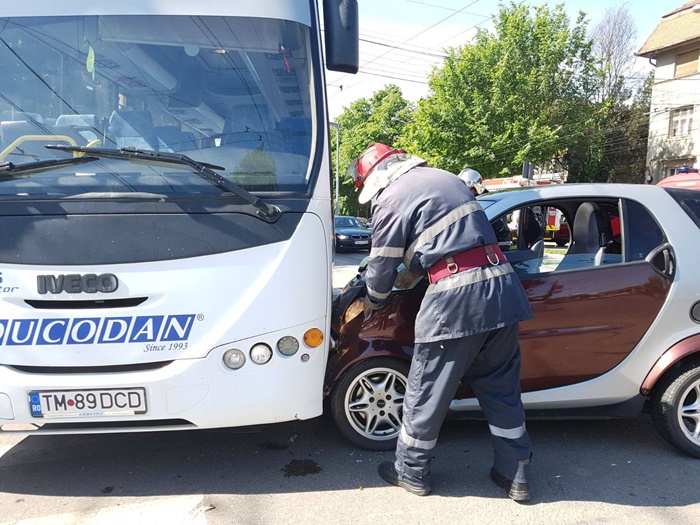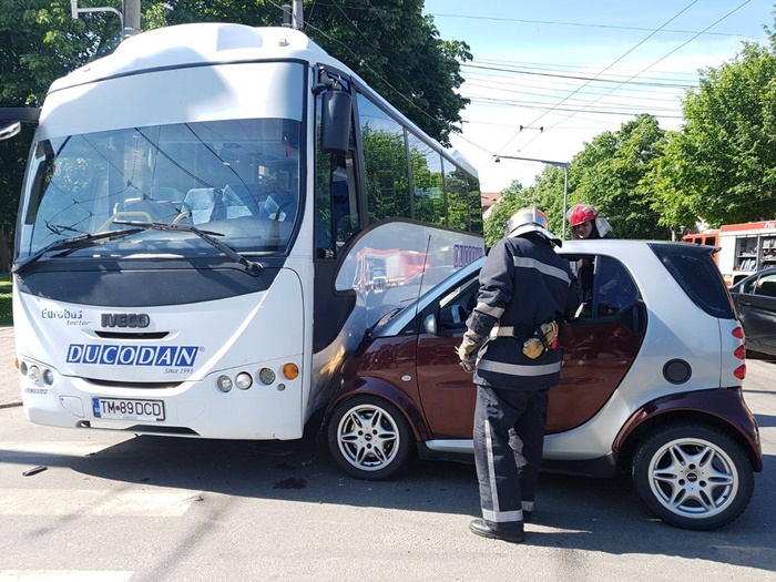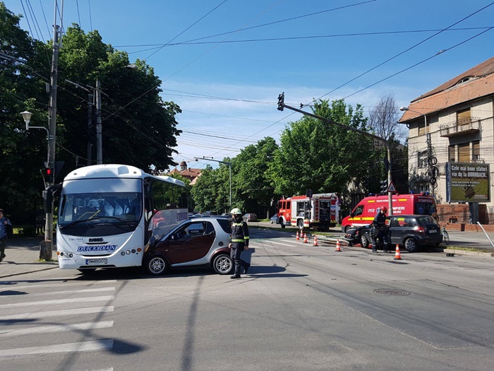 In urma impactului, Smartul a fost proiectat intr-un autobuz. Soferita care a provocat accidentul si conducatorul Smartului au fost usor raniti.