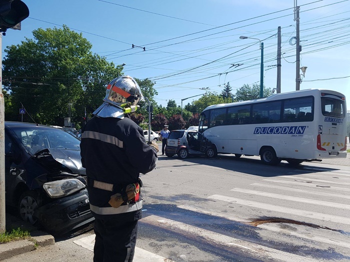 Potrivit primelor informatii, o soferita insarcinata, in varsta de 24 de ani, care venea pe splaiul Tudor Vladimirescu, dinspre Flora, a patruns in intersectie pe culoarea rosie a semaforului. Aceasta a lovit un Smart care venea pe podul Mihai Viteazu dinspre Catedrala si a virat la stanga catre Parvan.