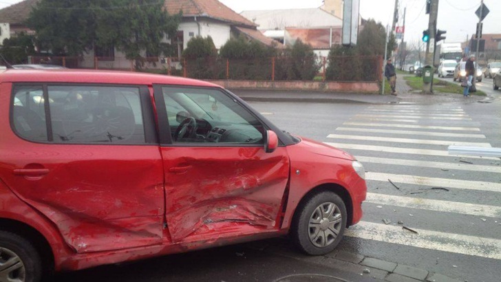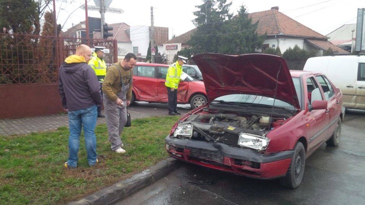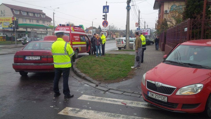 TIMISOARA. Ciocnire puternica in intersectia Liviu Rebreanu cu Brancoveanu sambata dupa-amiaza. O Skoda s-a izbit violent de un VW Vento. Din fericire, nimeni nu a fost ranit.