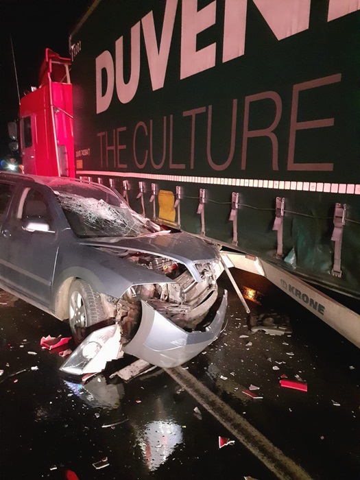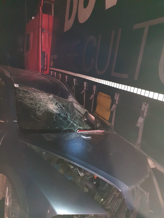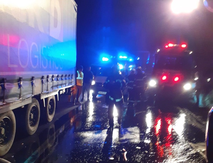 In cele trei autovehicule se aflau 5 persoane, soferii celor doua tiruri si alte trei persoane in masina. In urma accidentului soferul autoturismului, un tanar in varsta de 21 de ani, a ramas incarcerat, fiind scos de pompieri si predat medicilor. Prietenii soferului, in varsta de 20, respectiv 19 ani, au fost si ei transportati la spital.