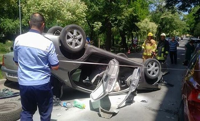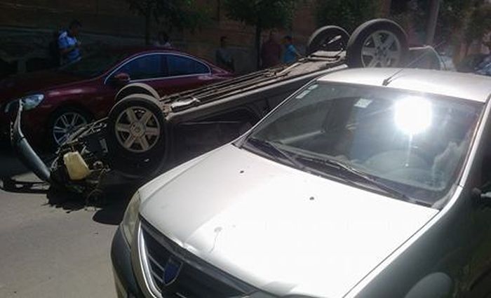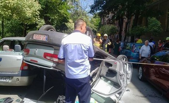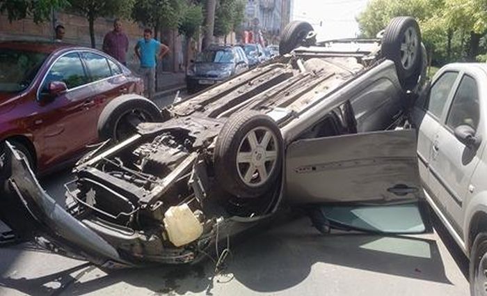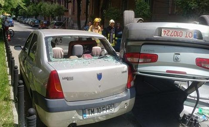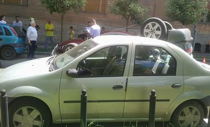 In urma ciocnirii, Renaultul s-a rasturnat cu rotile in sus, iar Volvo-ul izbit a lovit la randu-i si un Opel Corsa, de asemenea parcat.