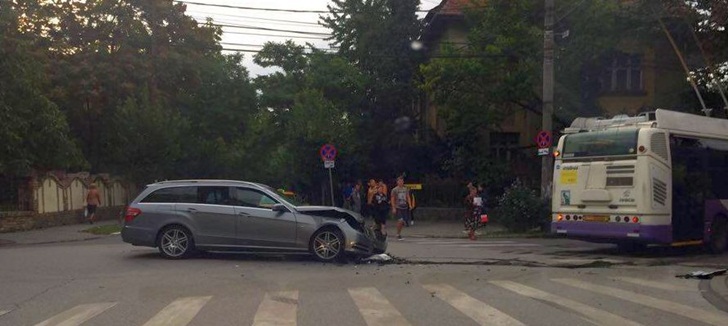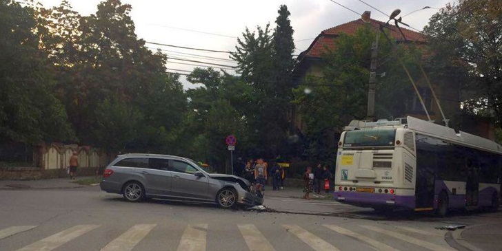TIMISOARA. Accident in instersectia din spatele Postei Mari, chiar la intrarea in Directia pentru Evidenta Persoanelor Timisoara. Doua masini, un Mercedes si un Audi, s-au izbit puternic, iar in urma impactului, una dintre ele a fost proiectata pe trotuar unde a lovit o tanara.
