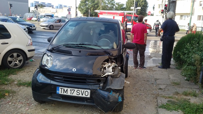 TIMISOARA. Accident spectaculos vineri dupa amiaza, pe unul dintre cele mai circulate bulevarde din Timisoara. Un Ford si un Smart s-au lovit frontal in intersectia dintre Bulevardul Liviu Rebreanu si strada Gheorghe Ranetti, insa din fericire, niciunul dintre soferi nu a patit nimic.