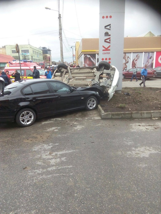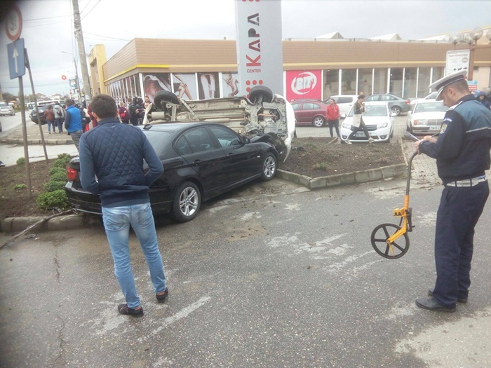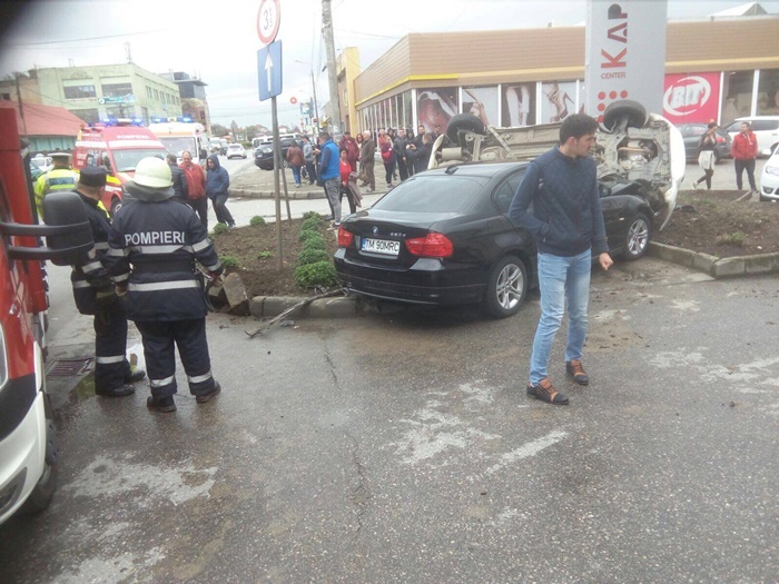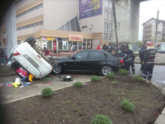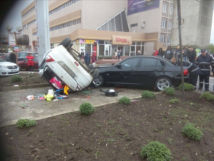 Accidentul s-a petrecut chiar in dreptul intrarii in parcarea unui centru comercial. Un BMW a izbit un Suzuki. In urma impactului, acesta din urma s-a rasturnat pe o parte si s-a proptit de un panou publicitar.