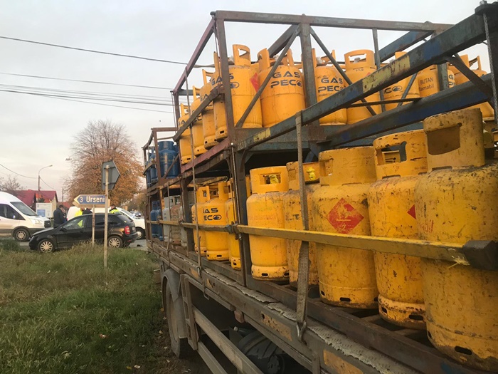 TIMISOARA. Grav accident de circulatie langa Timisoara, marti dimineata. O masina condusa de un sofer de 18 ani, in care se gaseau alti doi copii, a fost lovita de un camion incarcat cu butelii.