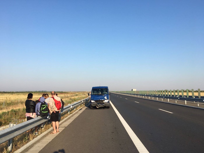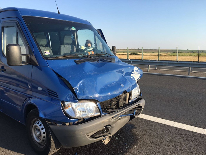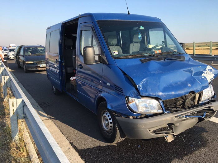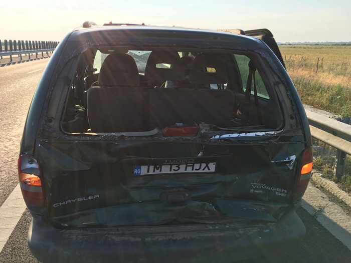 Un microbuz si o masina s-au ciocnit violent intre Recas si Izvin. 12 oameni se aflau in cele doua vehicule. Microbuzul, condus de un sofer bulgar, a izbit masina din spate.
