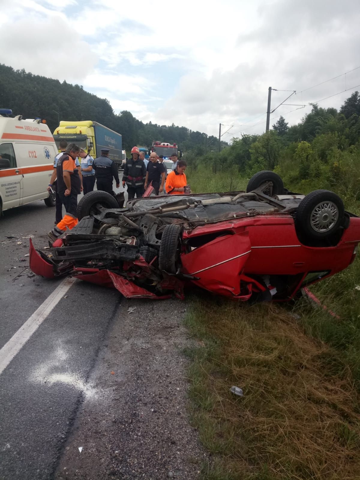 Impactul a fost extrem de puternic, masina s-a rasturnat pe marginea drumului. Femeia de 69 de ani a murit pe loc, iar sotul ei a ajuns la spital in stare grava, fiind resuscitat de un echipaj SMURD, noteaza reper24.ro.