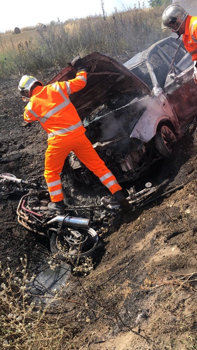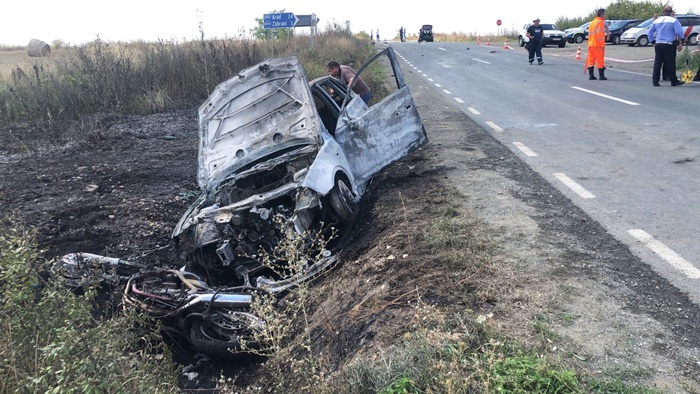 In urma impactului, motocicleta a fost aruncata intr-un alt autoturism, condus de o femeie. Cele doua vehicule au ajuns in santul de pe marginea drumului si au luat foc.