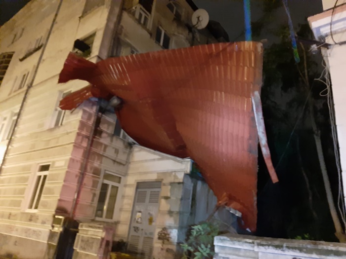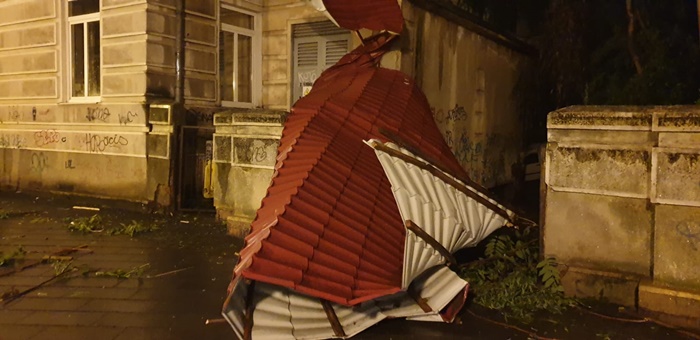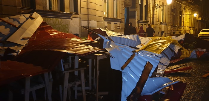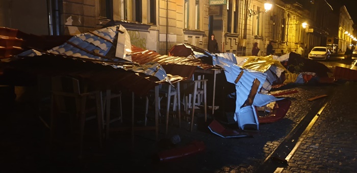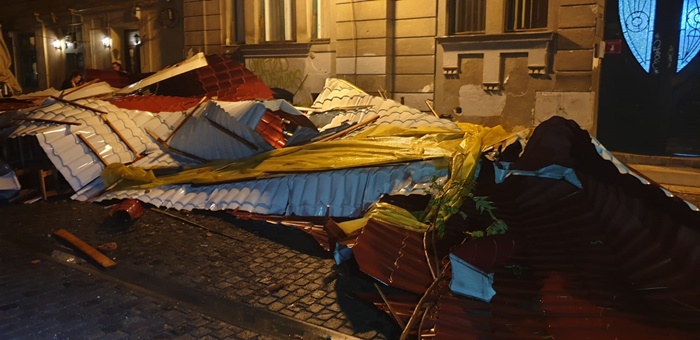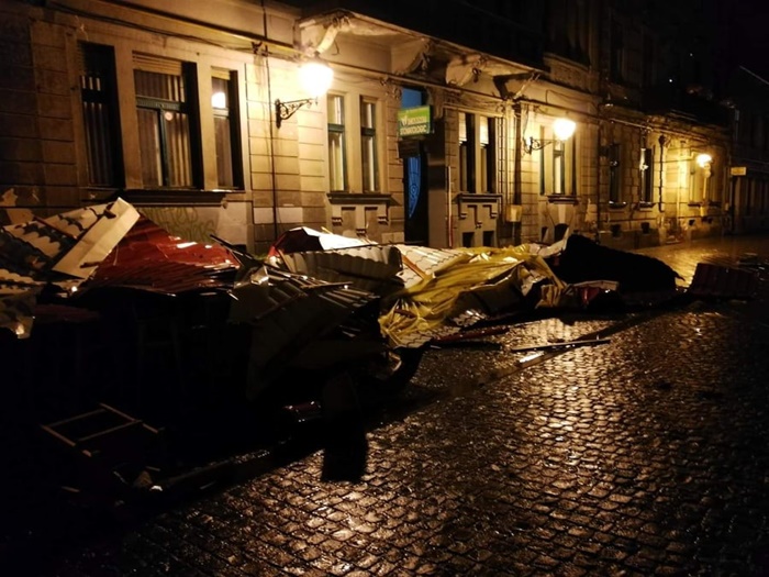 In Piata Unirii din Timisoara, vantul a smuls un acoperis de tabla si l-a aruncat in strada.