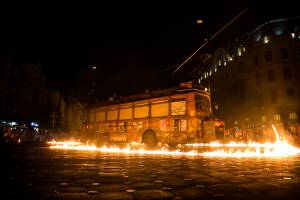 Actorii au mers pe sarma deasupra autobuzului in miscare, i-au dat foc si i-au introdus pe spectatori intr-o atmosfera suprarealista, in care sunetele si luminile s-au impletit fabulos. Costumele pe care actorii le-au purtat au conferit spectacolului o nota de originalitate.