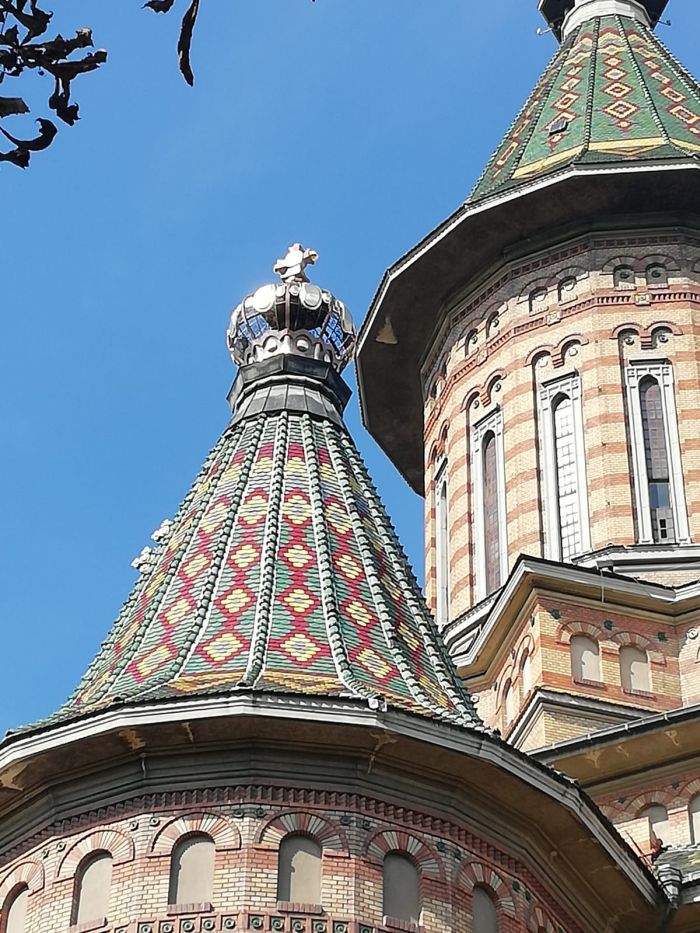 ”Cam 70 la suta a fost afectata de furtuna din septembrie, anul trecut. Este o cruce ornamentala de tip mitra care a fost asezata pe turnul aflat deasupra altarului. Structura de fier a fost refacuta, la fel si o parte dintre ornamente. Cealalta parte de ornamente e preluată de pe vechea cruce. Initial au fost 8 lentile mari si 16 lentile mici, iar toate acestea au fost recuperate sau refacute. Lentilele au fost aurite cu aur de 24 de karate. Materialul folosit la reconstructia crucii este platbanda de cupru si tabla de cupru”, a declarat arhidiacon ing. Timotei Anisorac, consilier Patrimoniu si Constructii in cadrul Mitropoliei Banatului.