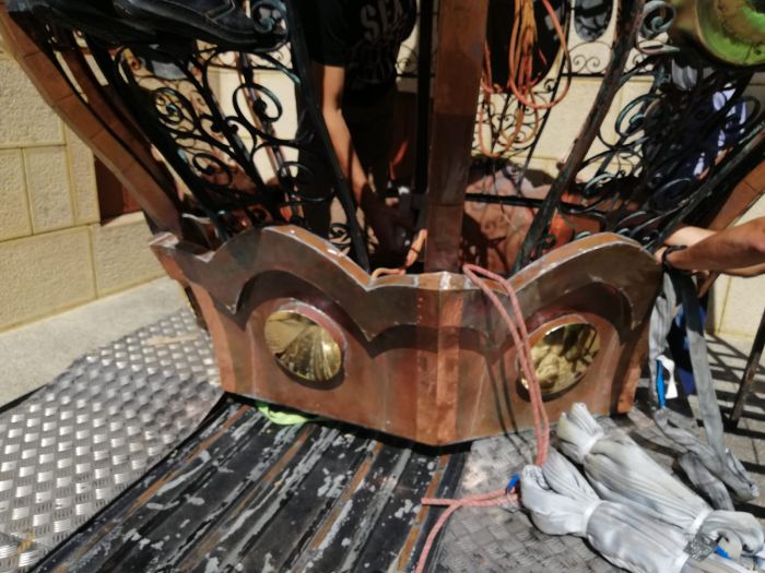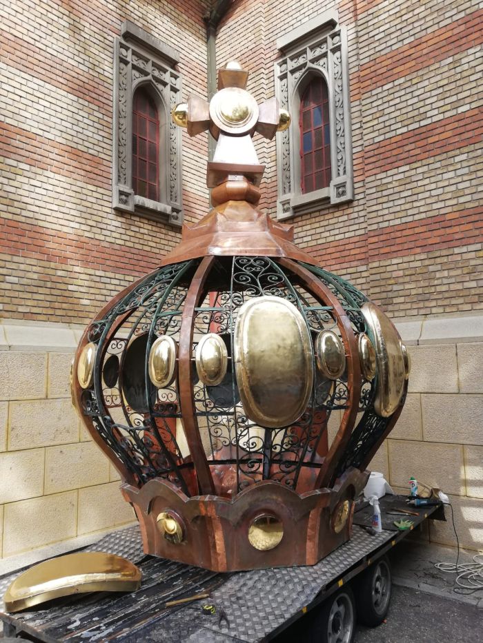 Mitra de pe turla aflata deasupra altarului, prabusita in septembrie anul trecut, a fost distrusa, astfel ca a fost nevoie de confectionarea uneia noi care sa o inlocuiasca.
