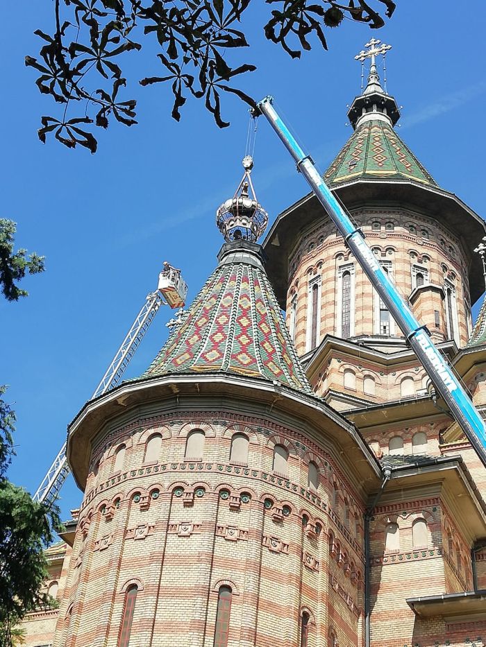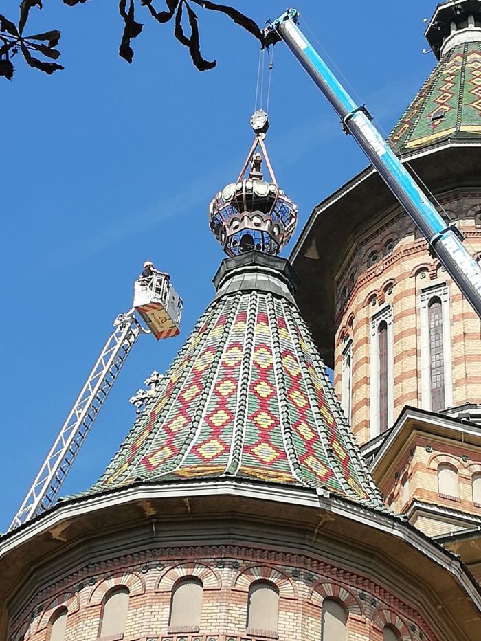 TIMISOARA. Forfota la Catedrala Mitropolitana joi dupa-amiaza. La exact un an de la furtuna devastatoare care a provocat pagube uriase la Timisoara, in septembrie 2017, si a daramat printre altele si o mitra de pe una dintre turlele Catedralei, aceasta a fost reasezata la locul ei pe sfantul lacas.