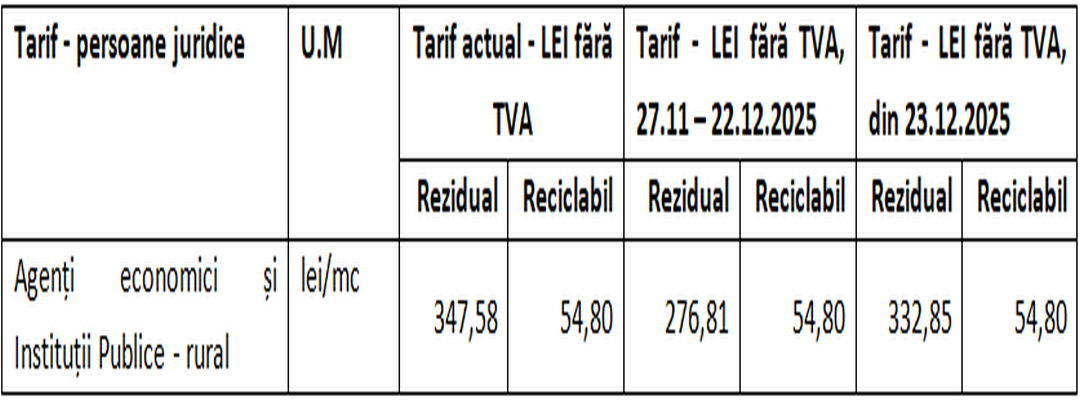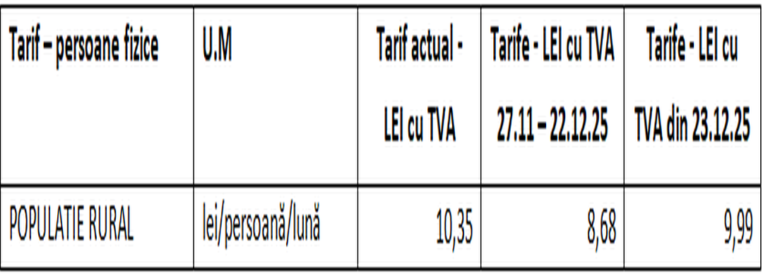 Tabelele de mai jos reflectă cele două etape succesive de aplicare a tarifelor aprobate: perioada 27 noiembrie 2025 – 22 decembrie 2025 și tarifele aplicabile începând cu data de 23 decembrie 2025, pentru mediul rural din Zona 1 a județului Timiș:
