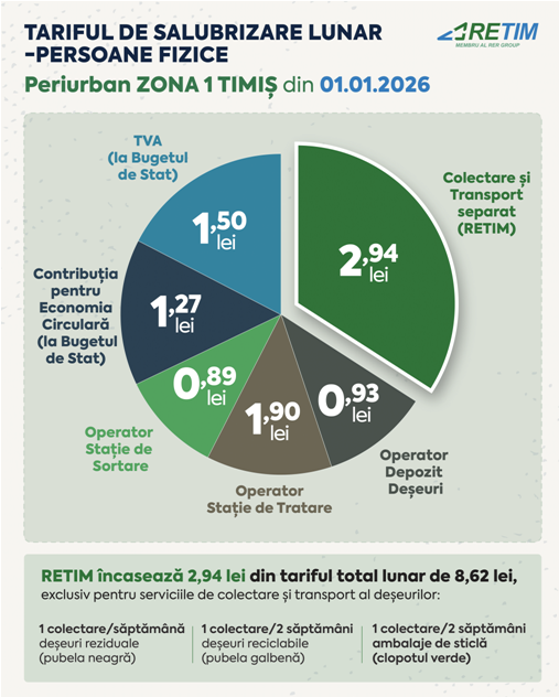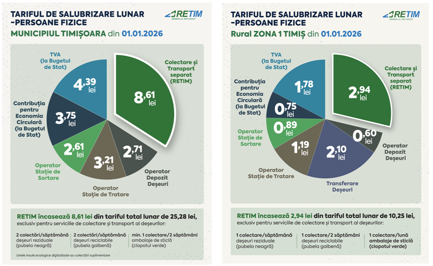 TIMISOARA. RETIM Ecologic Service S.A. informează toți utilizatorii serviciului de salubrizare (persoane fizice, asociații de proprietari/locatari, persoane juridice și instituții publice), Zona 1 Timiș, cu privire la modificarea tarifelor de facturare. Modificarea este determinată de ajustarea tarifelor de colectare și transport din Zona 1 Timișoara, aprobată prin Hotarârea AGA a Asociației de Dezvoltare Intercomunitară Deșeuri (ADID) Timiș nr. 5/20.01.2026.