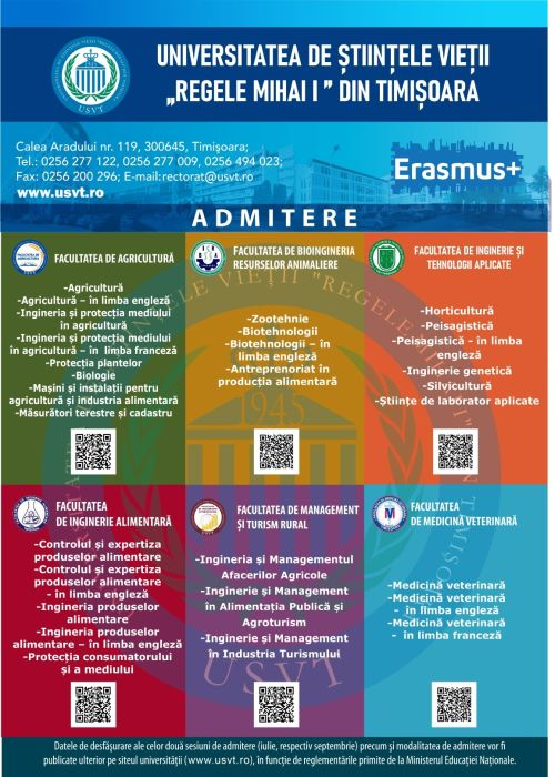 Universitatea de Stiintele Vietii ”Regele Mihai I” din Timisoara organizeaza concurs de admitere pe baza de dosar in perioada 8-24 iulie 2024, detalii in centrul de admitere Calea Aradului, nr.119 (www.usvt.ro ) si in cele 8 centre ( Drobeta Turnu-Severin, Resita, Horezu, Pecica, Deva, Târgu-Jiu, Moldova-Noua, Nadlag).
