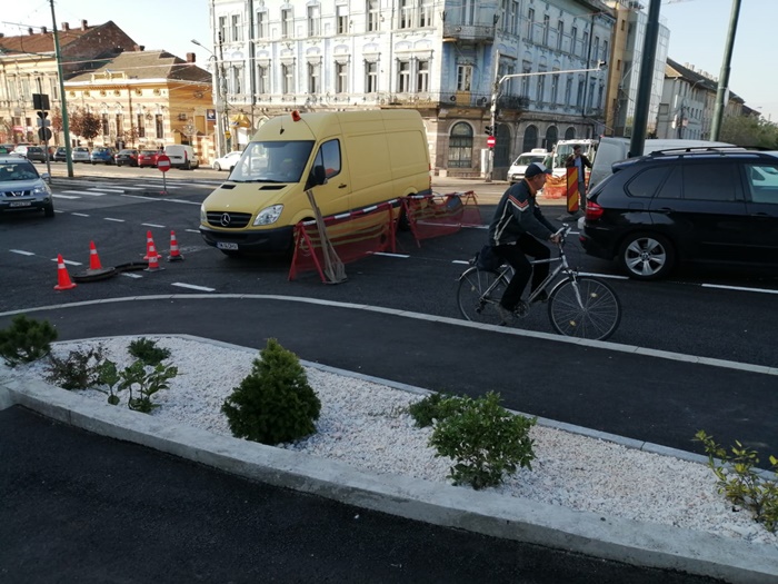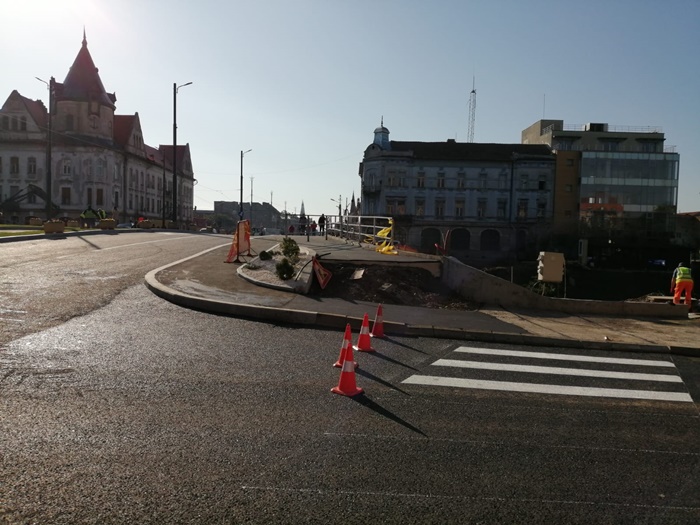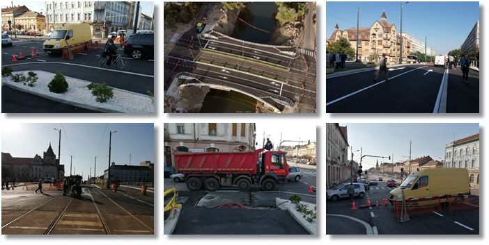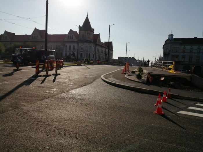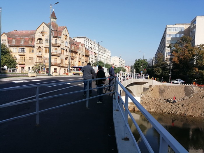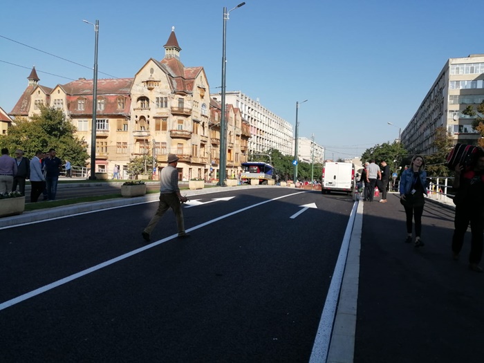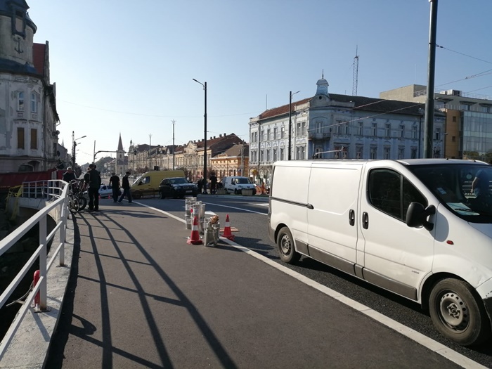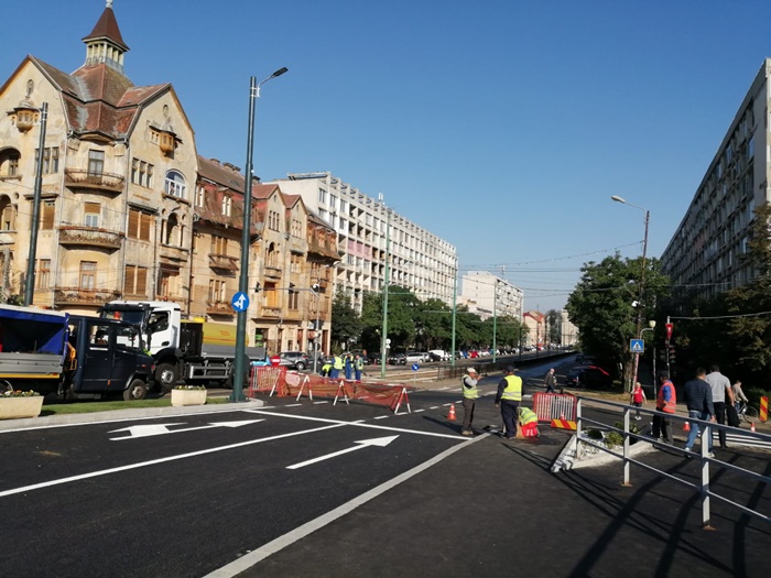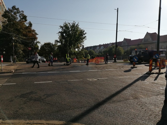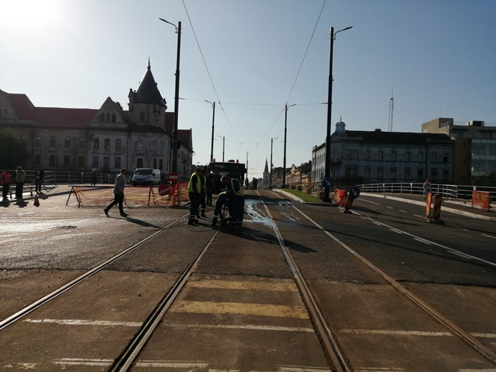 TIMISOARA. Forfota mare pe Podul Dragalina luni dimineata. Echipe de maturatori curata de zor fiecare fir de praf, utilajele firmei de salubrizare spala bordurile, angajati STPT fac ultimele retusuri la liniile de tramvai, iar muncitorii pun ultimele petice de asfalt in zonele pietonale de la capetele podului.