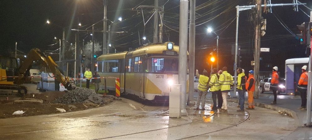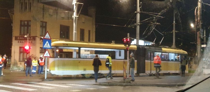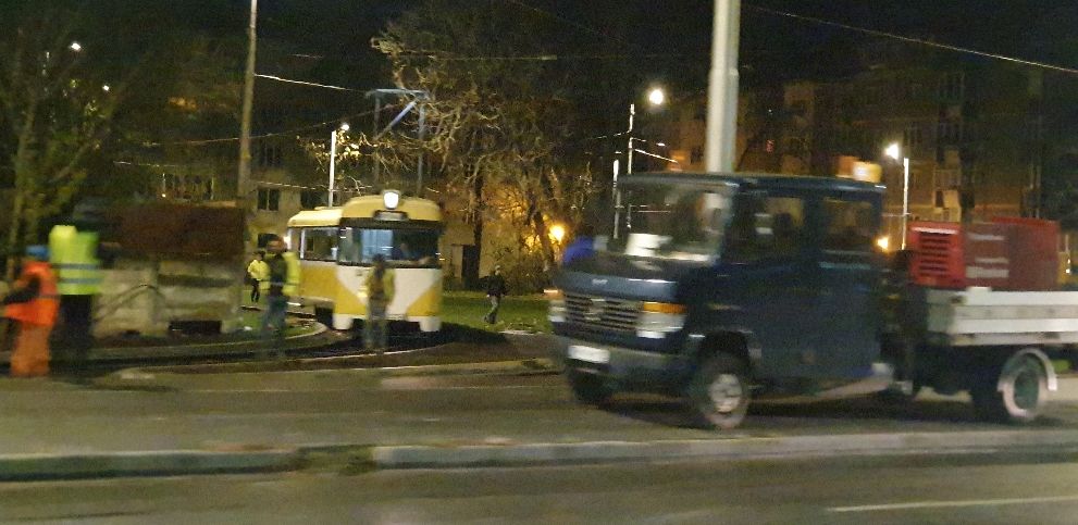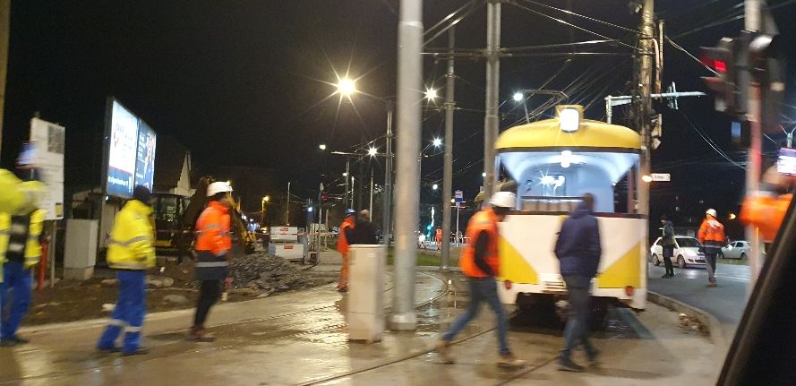 TIMISOARA. Situatie de rasu’-plansu’ pe bulevardul Cetatii din Timisoara, aflat pe ultima suta de metri cu reabilitarea. S-a facut prima proba cu tramvai pe noile linii, iar garnitura a sters in mers un stalp care sustine firele de contact, pentru ca spatiul dintre linie si stalp este prea ingust.
