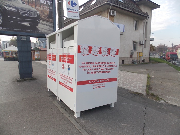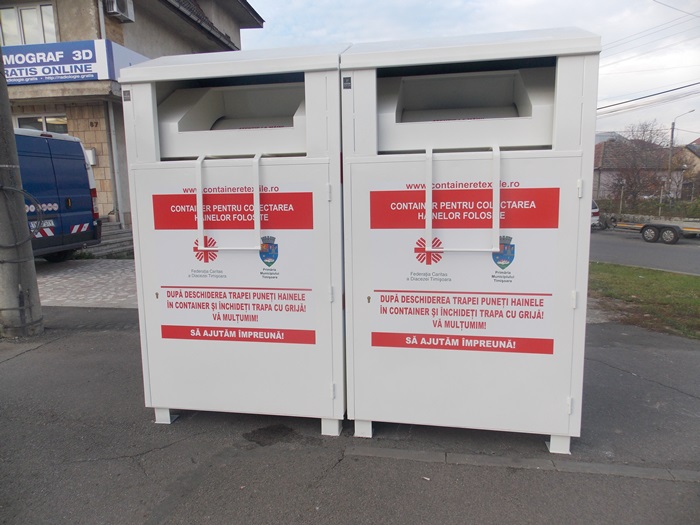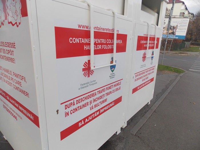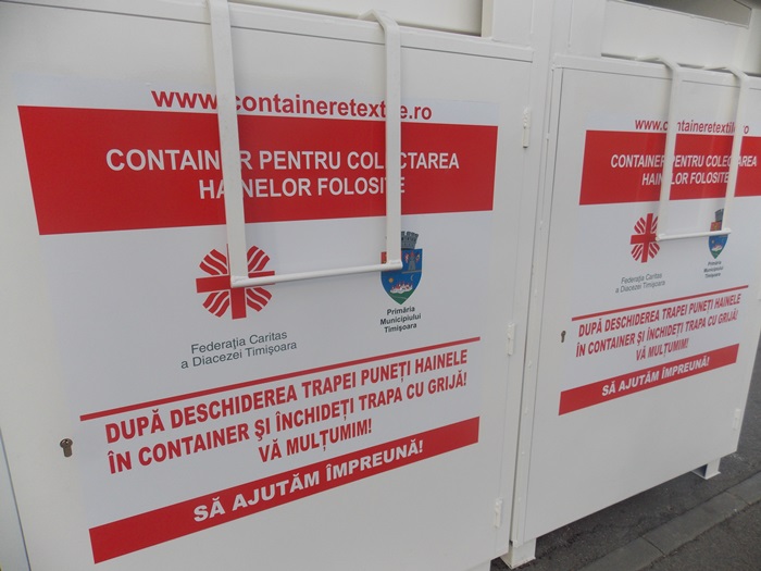In total, in 10 cartiere din Timisoara sunt amplasate cate doua containere, in care oamenii pot sa lase haine, incaltaminte sau jucarii. Iar pe fiecare container este trecut si un numar de telefon, la care oamenii pot suna sa anunte daca recipientele sunt deja pline, pentru ca reprezentantii Caritas sa le poata goli.