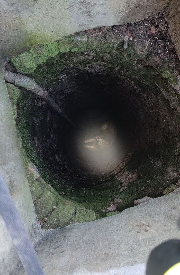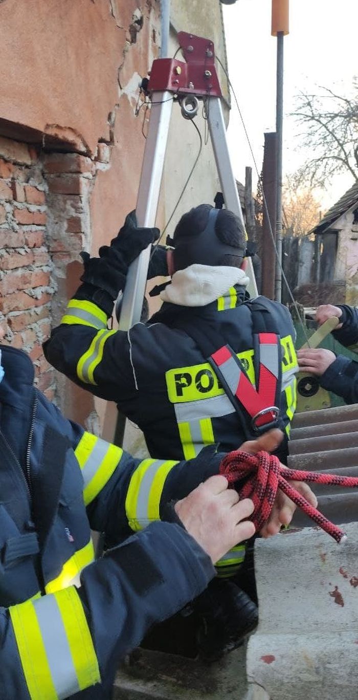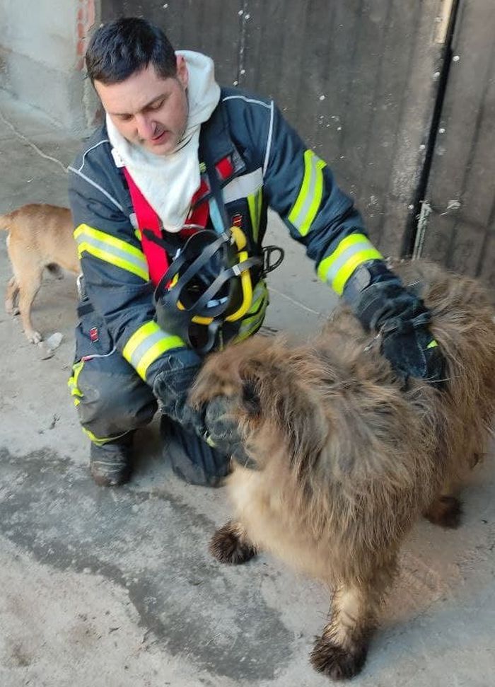 Oamenii au sunat imediat la 112, iar la fata locului a ajuns un echipaj cu patru pompieri. Salvatorii au instalat echipamentul de interventie, iar unul dintre ei a coborat in groapa in care catelul astepta nemiscat. Pompierul a luat animalul in brate si l-a scos la lumina.