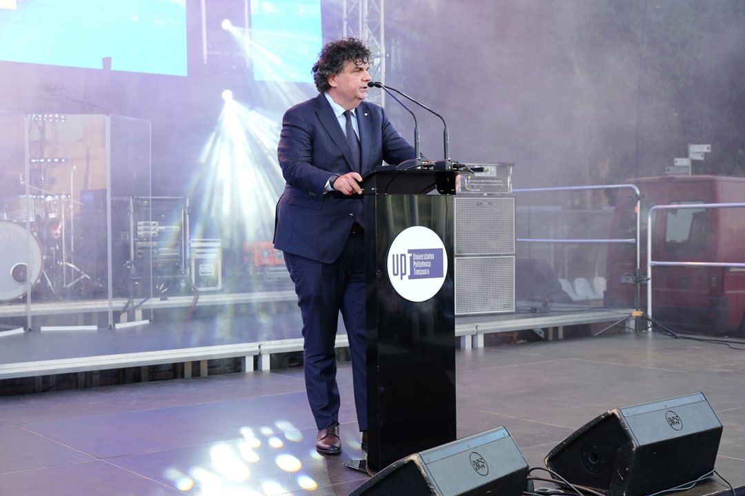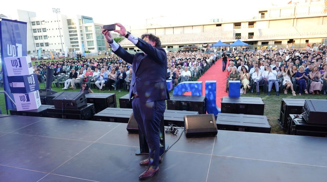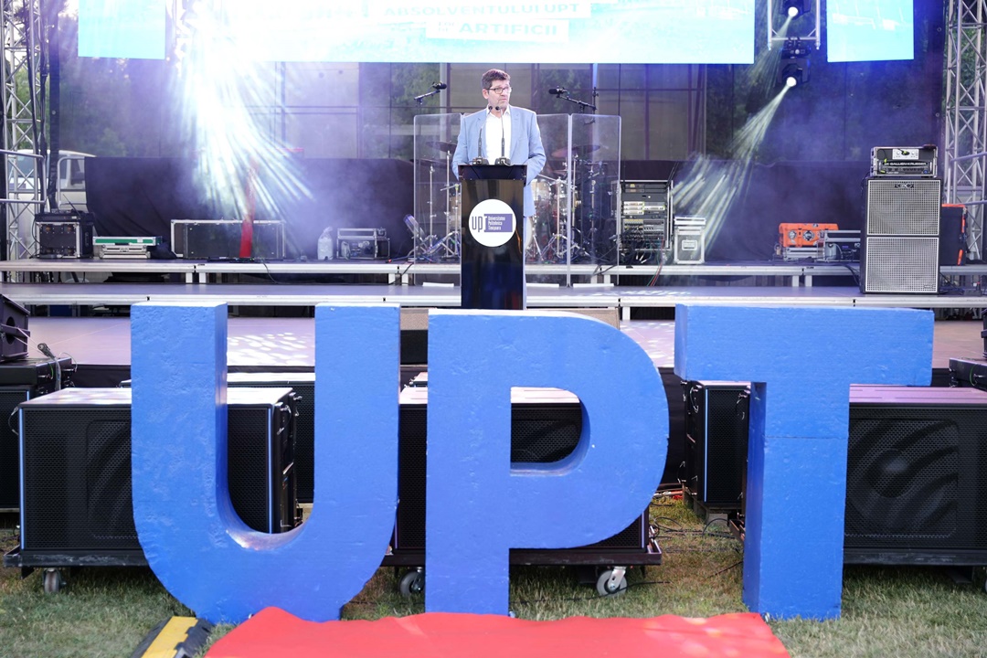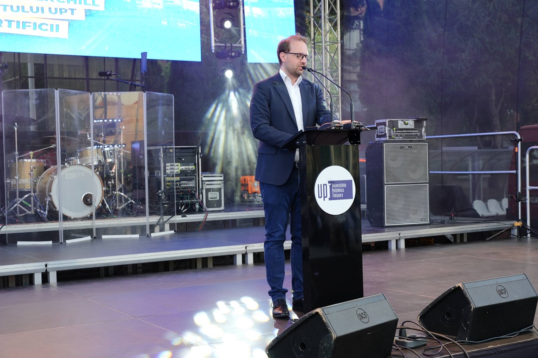 În debutul ceremoniei, după intonarea imnului academic al UPT de către cunoscutul muzician Horia Crișovan, compozitorul acestuia, rectorul Universității Politehnica Timișoara, conf.univ.dr.ing. Florin Drăgan, i-a felicitat pe absolvenții generației 2025, una a schimbării, care a prins în perioada studenției și pandemia, dar și Timișoara – Capitală Culturală a Europei în 2023, și a făcut o paralelă între festivitatea de absolvire de acum 30 de ani, când a terminat Facultatea de Automatică și Calculatoare a UPT și Ceremonia de Absolvire din 2025, dar și între oportunitățile de pe piața muncii de acum 30 de ani și cele de azi. În finalul discursului său, rectorul Universității Politehnica Timișoara a făcut un gest simbolic pe care, după cum a declarat, nu-l putea face acum 30 de ani – un selfie cu absolvenții.