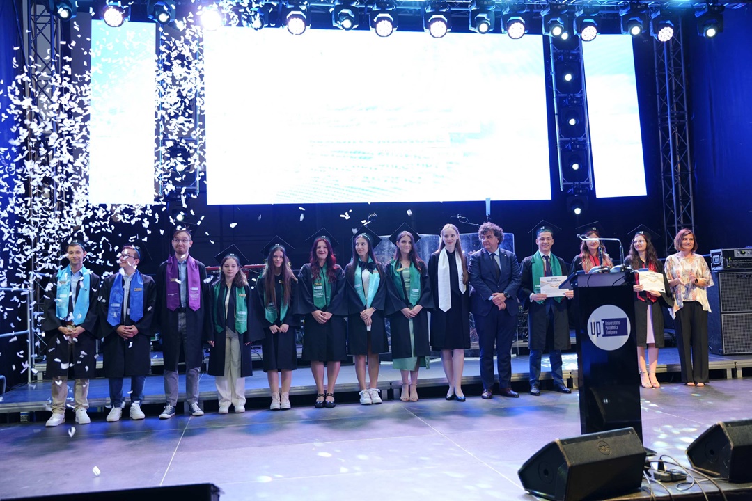 Reprezentanții mediului economic – Anca Flueraș, Area retail manager BCR România, Alexandru Plocon, Manager Financiar Continental Anvelope, Christian von Albrichsfeld, reprezentantul Consiliul Executiv al Comitetului Director al Universității Politehnica Timișoara – i-au felicitat pe absolvenții promoției 2025 pentru reușita lor, le-au vorbit despre lumea în schimbare, în care inovarea și determinarea le pot asigura succesul în carieră, despre importanța diplomei pe care au obținut-o, i-au îndemnat să continue să investească în ei și în pregătirea lor, să fie curajoși și capabili să ia decizii, să fie atenți la provocările cărora vor trebui să le facă față, dar și a oportunităților pe care le ascund acestea, să nu le fie teamă de schimbările care vor veni, ci să se implice pentru a crea lumea de mâine.