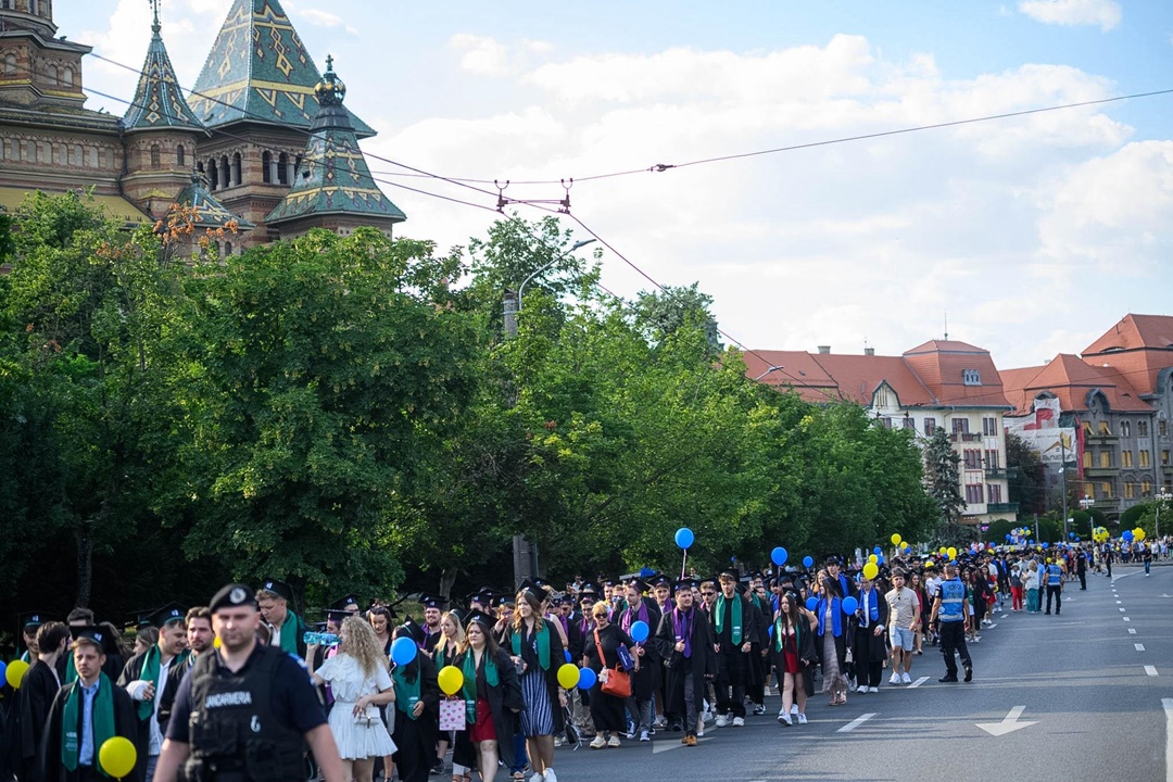 Ceremonia de absolvire propriu-zisă a început duminică, 29 iunie 2025, în Piața Victoriei, pe platoul din fața Rectoratului UPT, unde absolvenții, îmbrăcați în robe, însoțiți de părinți și prieteni, s-au reunit pentru deja tradiționala Paradă a Absolvenților. Coloana, acompaniată de formația SuperChill, s-a îndreptat, sub privirile curioase ale trecătorilor, spre Stadionul Știința, locul de desfășurare al ceremoniei, moderată anul acesta de îndrăgitul actor Marius Manole.