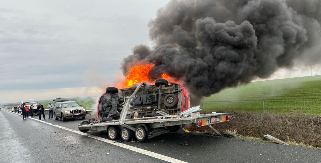 Șoferul șlepului a observat la timp flăcările și a tras rapid pe banda de urgență, unde autospeciala, care era destinată pacientilor cu dializă, s-a prăbușit din cauza manevrei bruște.
