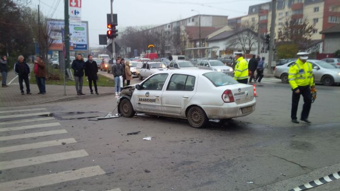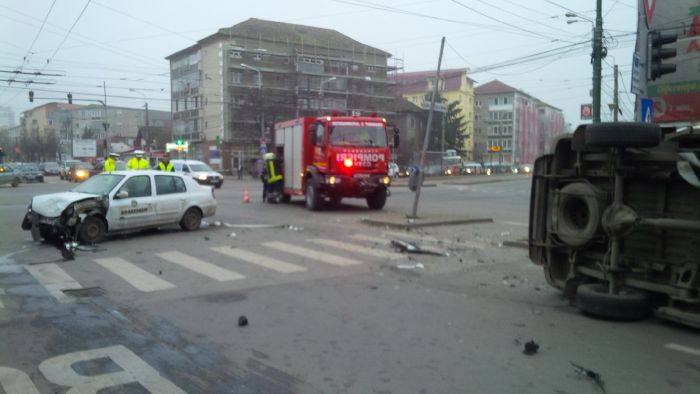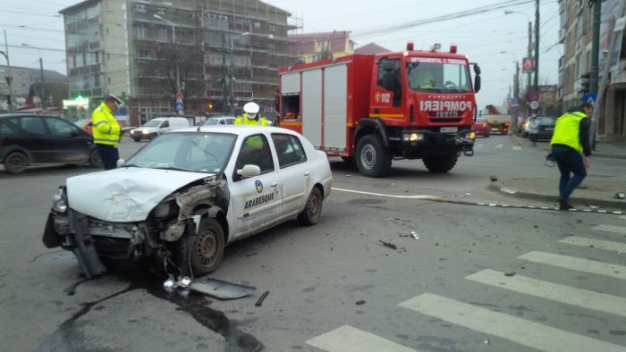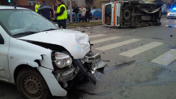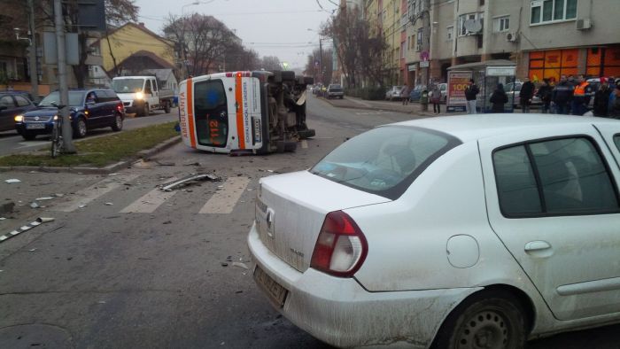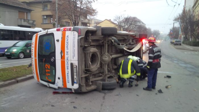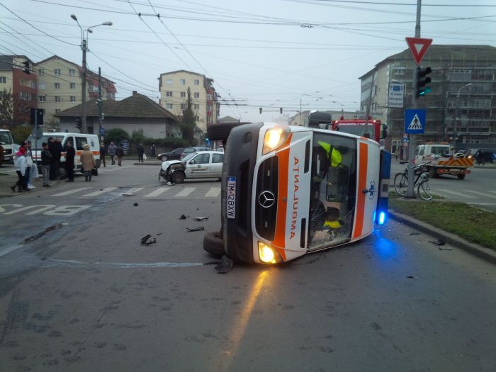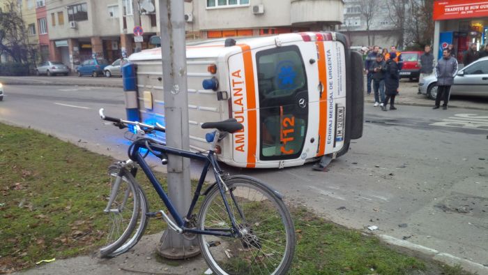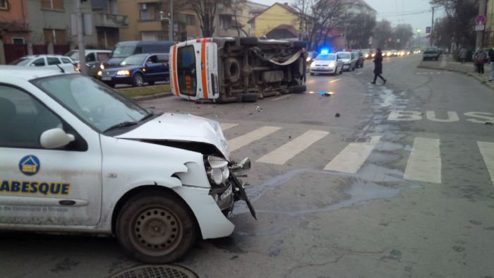 Cele doua masini, ambulanta si Renaultul s-au ciocnit in intersectie, iar ambulanta s-a rasturnat pe o parte. In cadere, aceasta a acrosat si un biciclist.