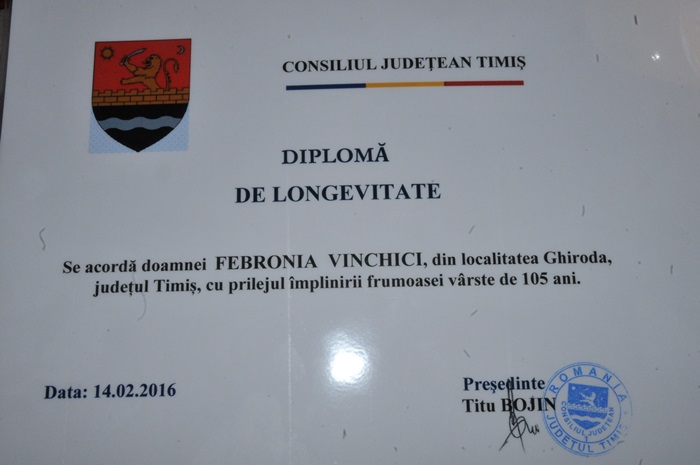 TIMISOARA. Se numeste Febronia Vinchici si a implinit incredibila varsta de 105 ani. Aniversarea a fost una cat se poate de frumoasa, mai ales ca a venit sa ii spuna “La multi ani!“, chiar presedintele Consiliului Judetean Timis, Titu Bojin.