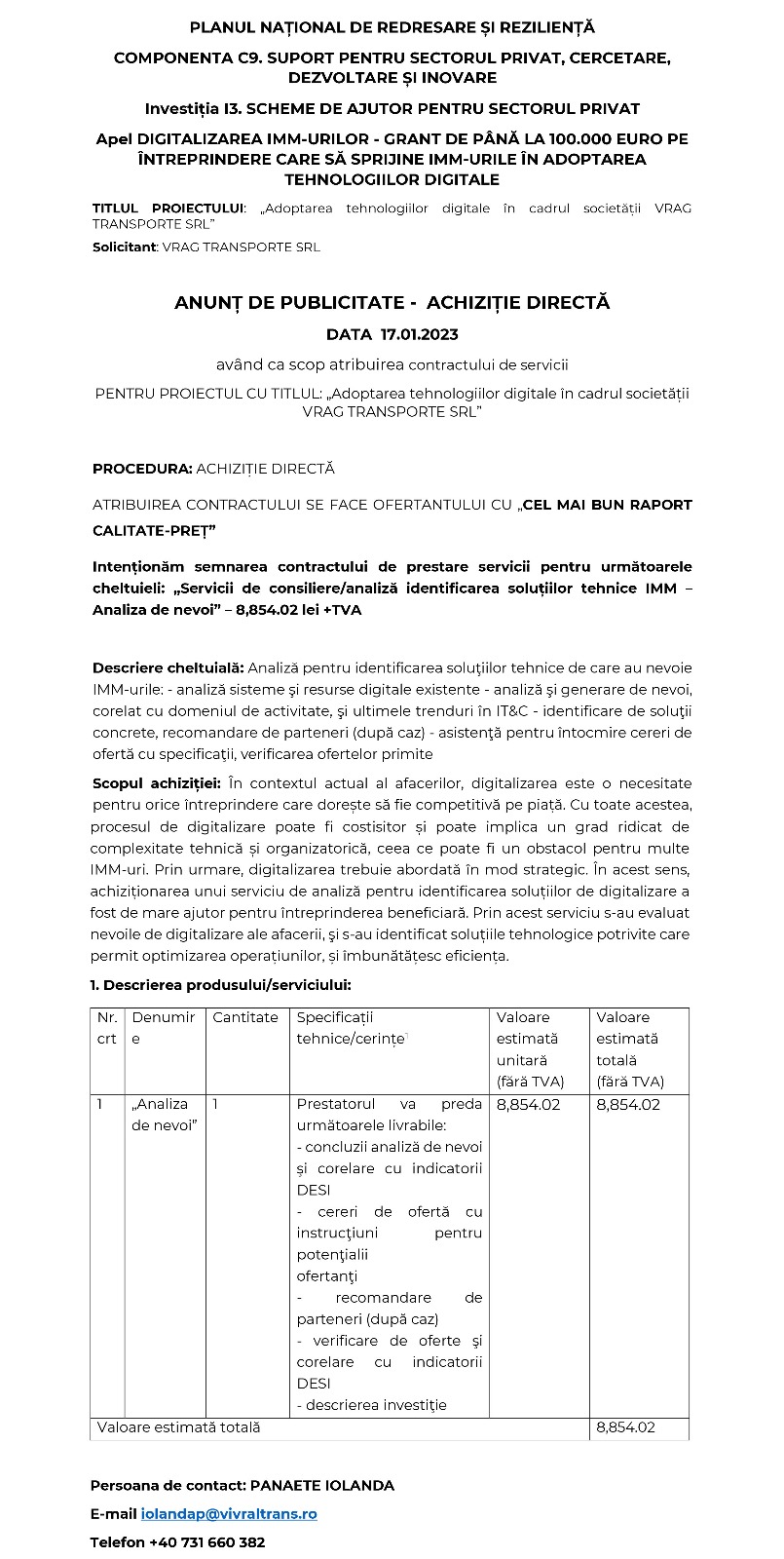 Anunț de publicitate – Achiziție directă pentru proiectul „Adoptarea tehnologiilor digitale în cadrul societății VRAG TRANSPORTE SRL”