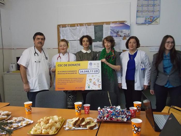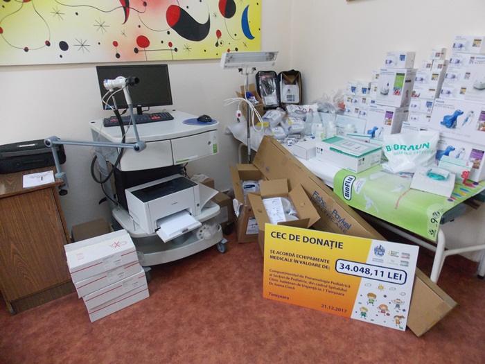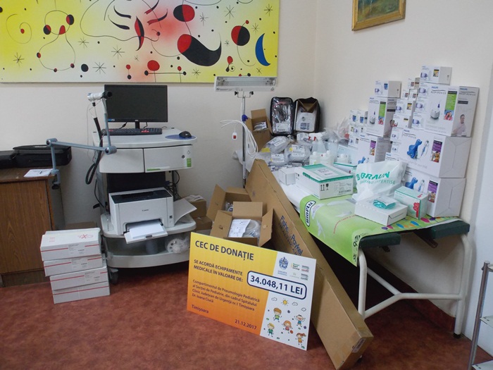 TIMISOARA. O noua mana de ajutor intinsa copiilor din Timisoara. O asociatie si mai multe firme au facut o donatie importanta Compartimentului de Pneumologie Pediatrica din cadrul Sectiei de Pediatrie a Spitalului Judetean. Este vorba de aparatura medicala, in valoare de aproape 35.000 de lei, ce va ajuta copiii cu probleme pulmonare.