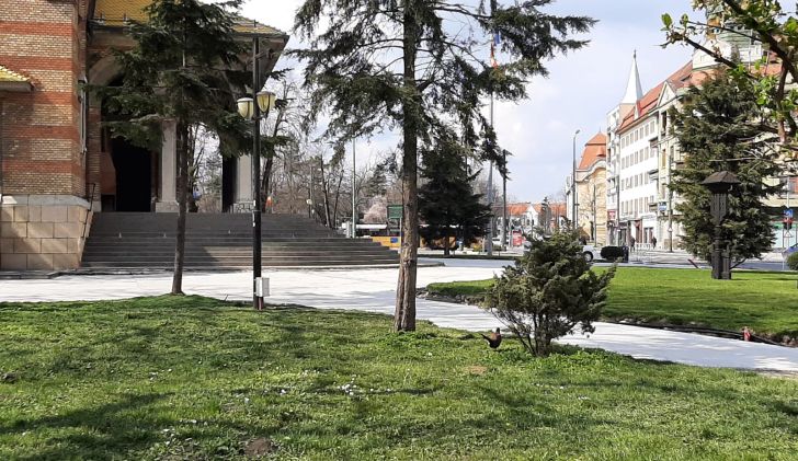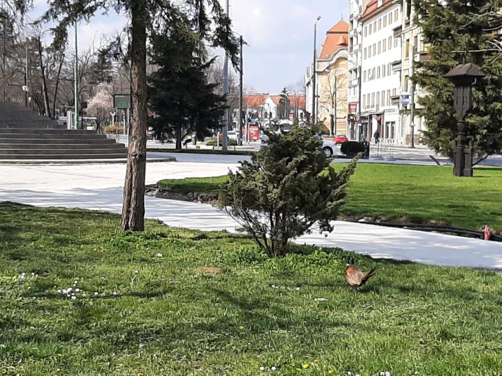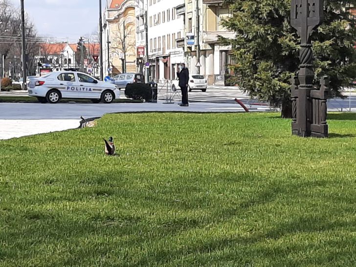 Sambata fiind si carantina, cel putin pe hartie, traficul in Timisoara e ceva mai relaxat, astfel ca pasarea a prins curaj si s-a plimbat minute in sir, fara sa fie deranjata.
