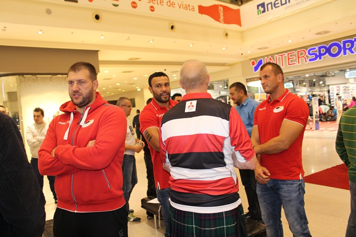 TIMISOARA. Campioanele Romaniei si Scotiei se intalnesc sambata in primul meci din grupele Challenge Cup la rugby. Inaintea partidei, reprezentantii celor doua echipe au participat la o conferinta de presa comuna intr-un mall din Timisoara, insa au avut parte si de o surpriza.