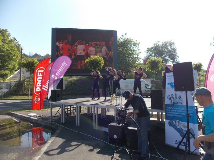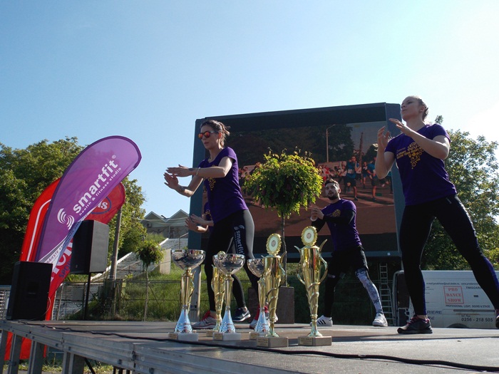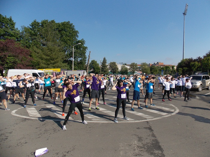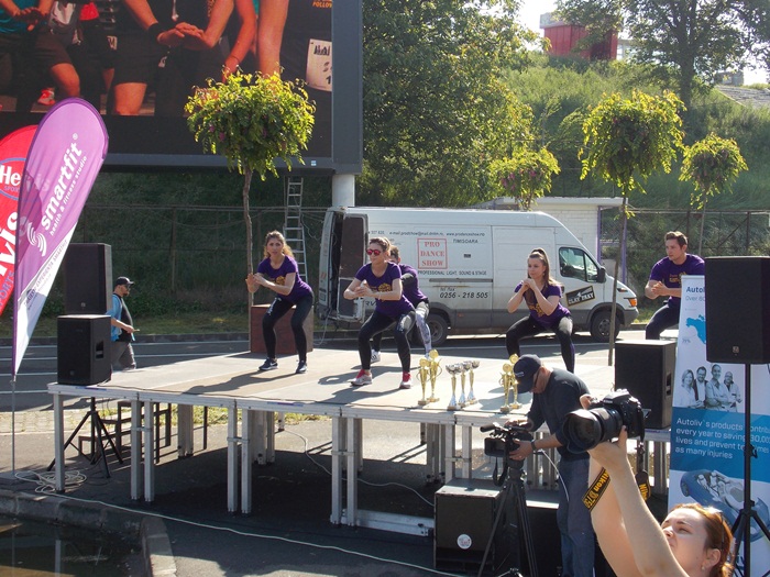 Intre proba de ciclism si cea de atletism, concurentii au facut o incalzire ca la carte alaturi de instructorii unei sali de fitness din oras, pe muzica lui Sean Norvis si MC Steliano.