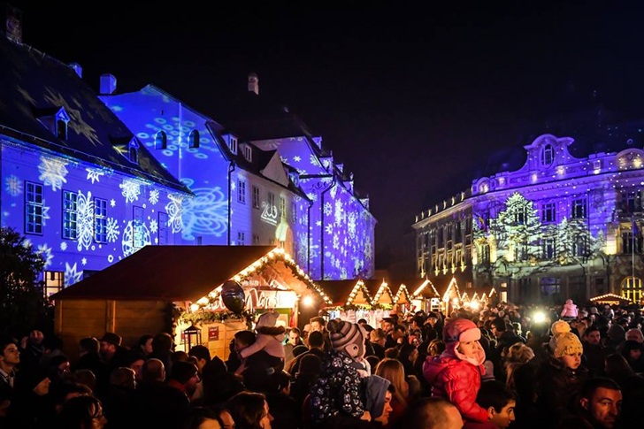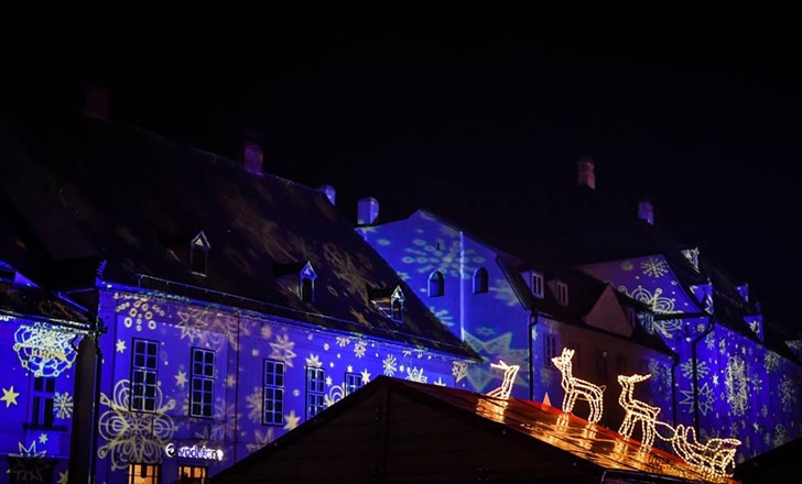 Targul de Craciun de la Sibiu a implinit 10 ani si a marcat aniversarea printr-o premiera: cladirile din jurul pietei s-au umplut cu zapada… virtuala. Fulgi mari au fost proiectati pe fatade.