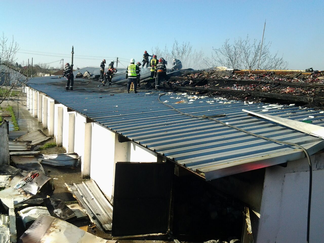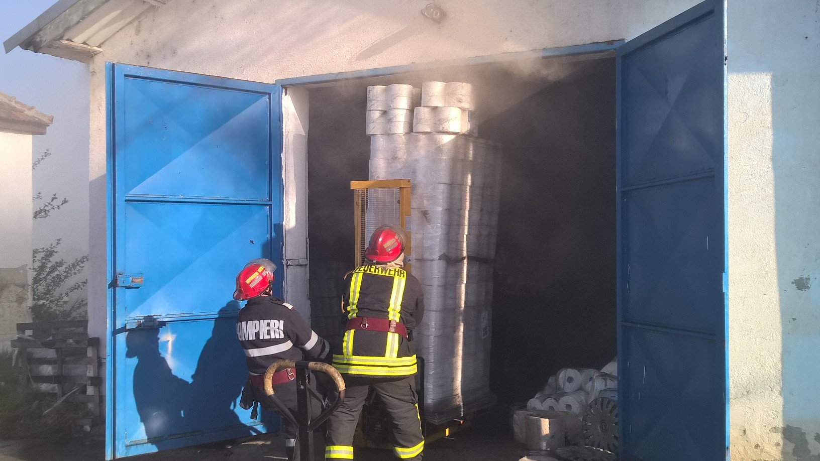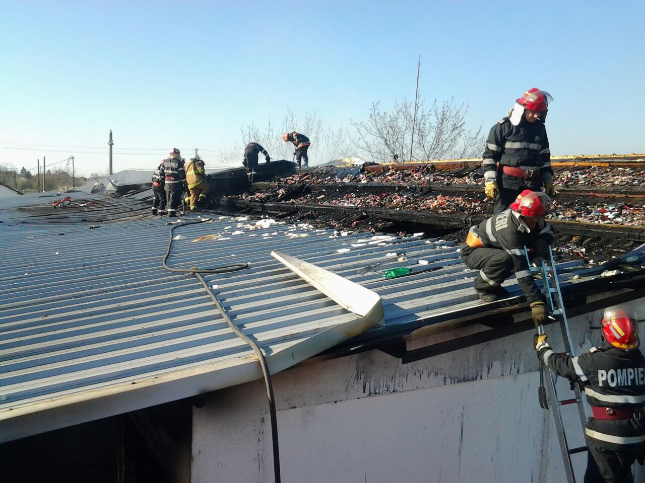UPDATE: Pompierii au reusit sa stinga focul cu ajutorul a trei autospeciale cu apa si spuma. Ei au intampinat probleme mai mari la stingerea acoperisului, mai precis a izolatiei termice din spuma poliuretanica. O buna parte din materialele depozitate – sanitare, hartie igienica, detergenti, etc. – au fost recuperate.
