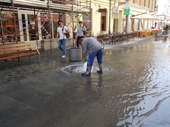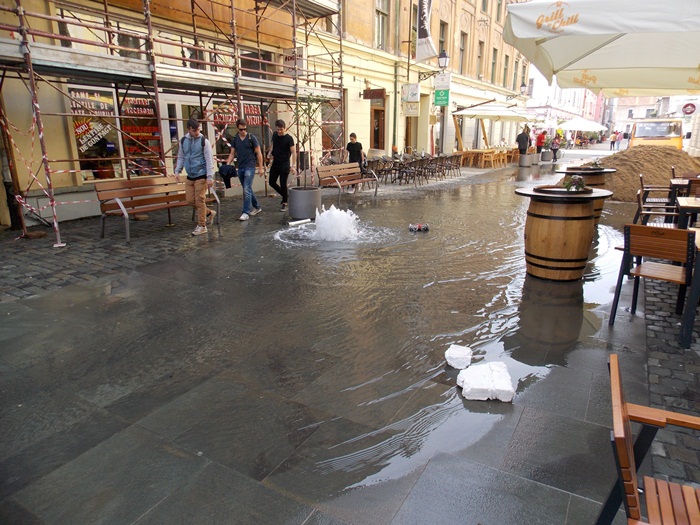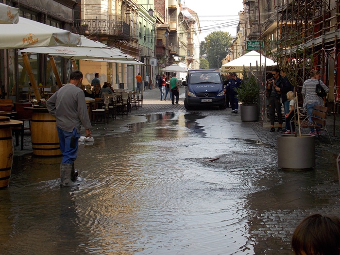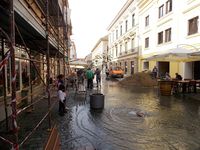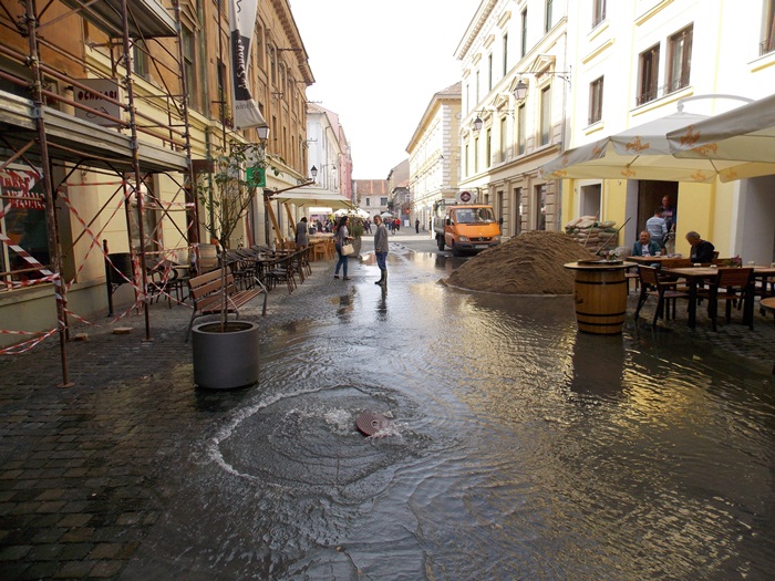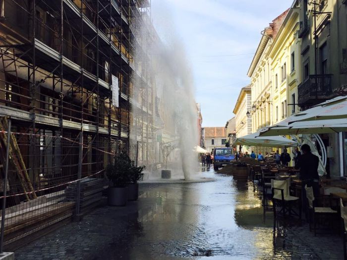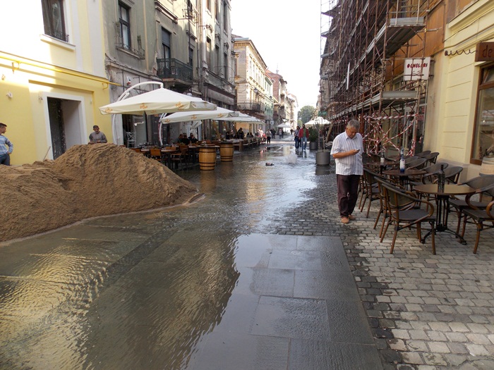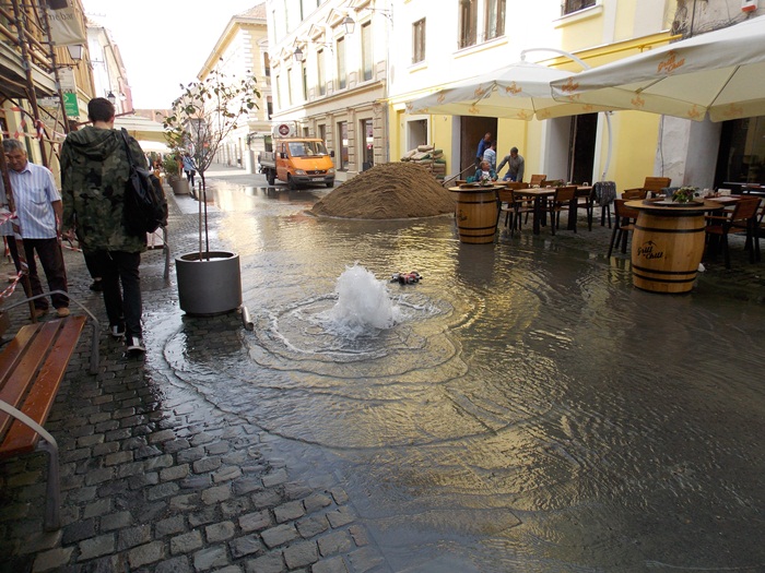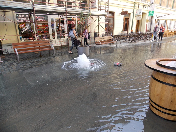 Pe strada cu pricina se lucreaza in acest moment la reabilitarea unei cladiri istorice, chiar in dreptul locului in care s-a s-a ‘nascut’ fantana, care a provocat inundatia.