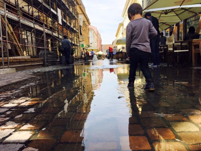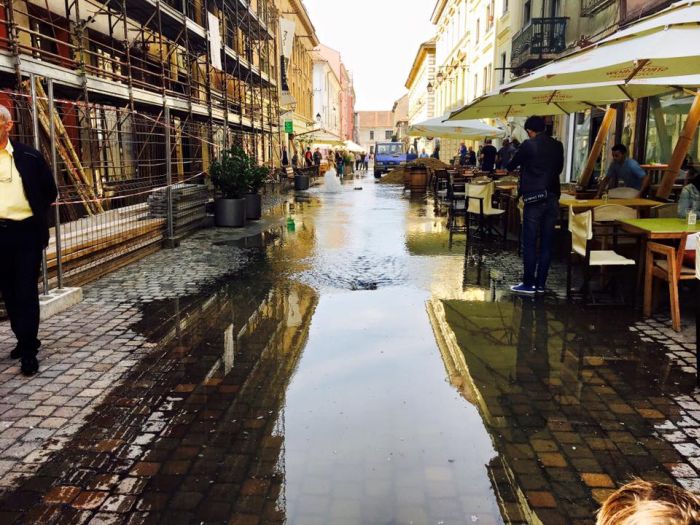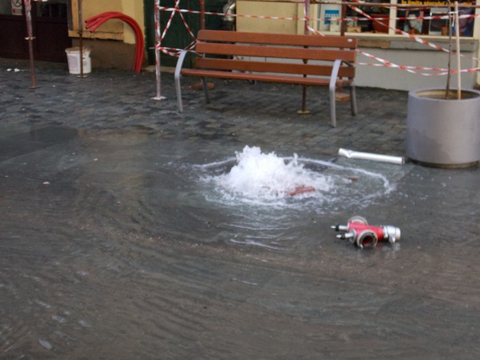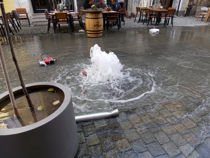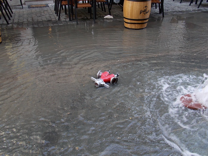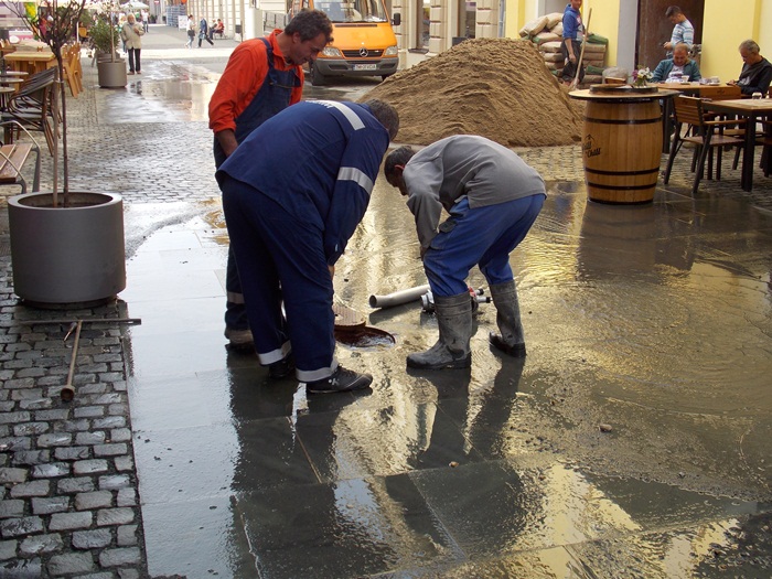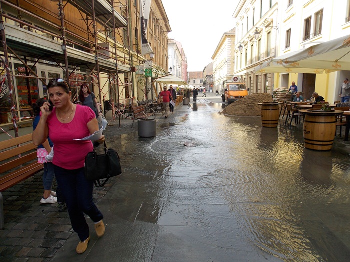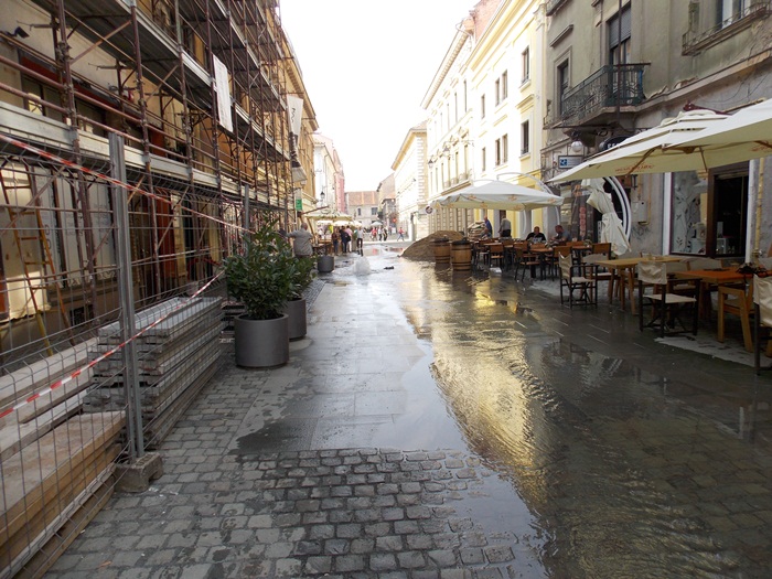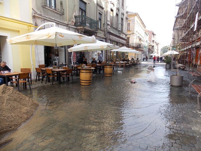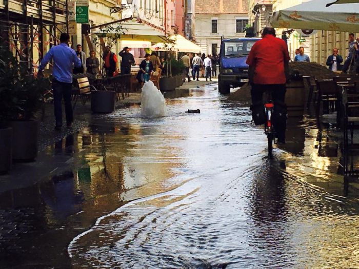 Pe strada cu pricina se lucreaza in acest moment la reabilitarea unei cladiri istorice, chiar in dreptul locului in care s-a s-a ‘nascut’ fantana, care a provocat inundatia.