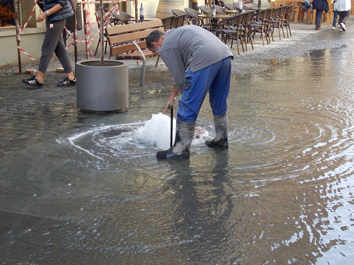Unul dintre lucratori s-a apucat sa evacueze apa cu ajutorul unui… pahar, spre hazul trecatorilor. La un moment dat insa, s-a lasat pagubas si a pelcat in cautarea unui recipient ceva mai… incapator.