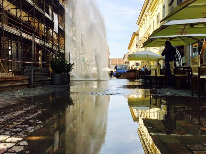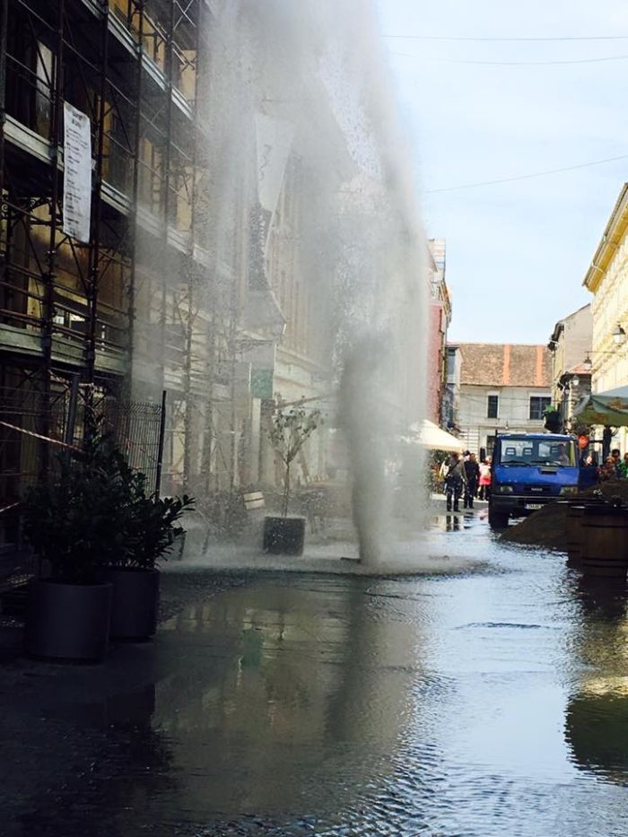 TIMISOARA. Un adevarat spectacol in mijlocul strazii la Timisoara, chiar in centrul istoric. O arteziana inalta de cativa metri a tasnit si a inundat strada Eugeniu de Savoya, la doi pasi de Piata Unirii.