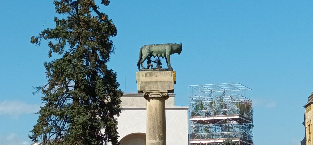 Copie a celebrei Lupa Capitolina, monumentul a fost instalat in centrul orasului in 23 aprilie 1926, pe un soclu de 4,49 de metri.