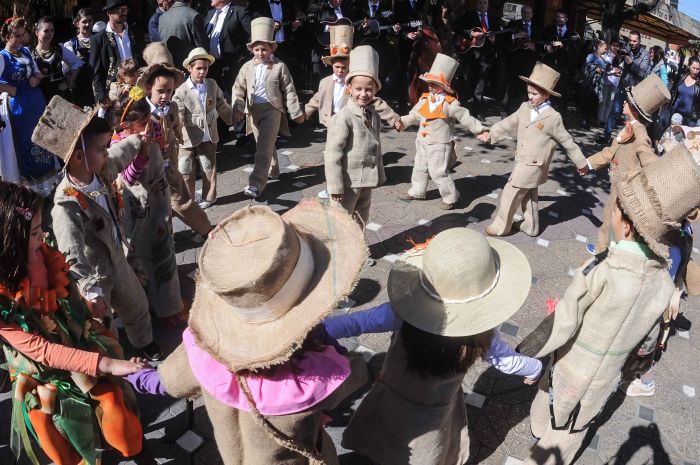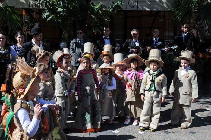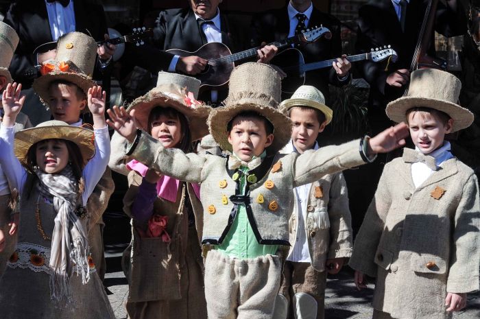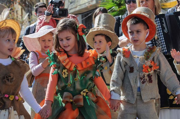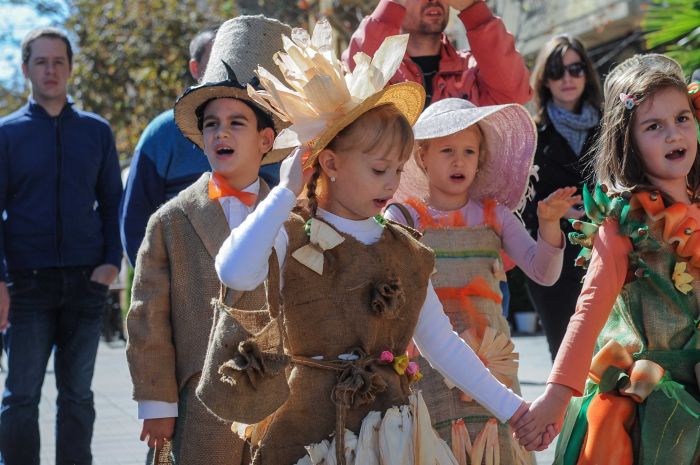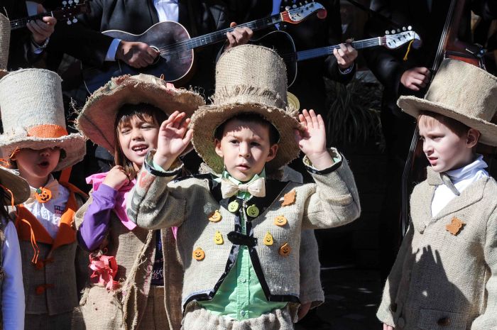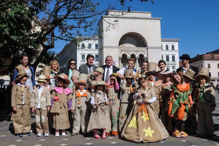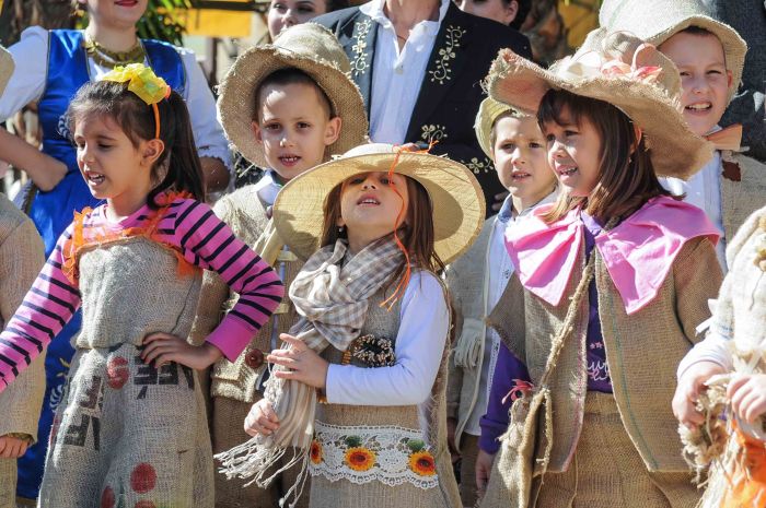 Vecinii sarbi au gasit de cuviinta sa puna la cale o invitatie-eveniment tocmai la noi, in Timisoara. Copii imbracati in straie inedite – din acelasi material din care pe vremuri erau confectionati sacii – impodobite cu elemente ale toamnei, altii imbracati in dovleci, au umplut centrul Timisoarei.
