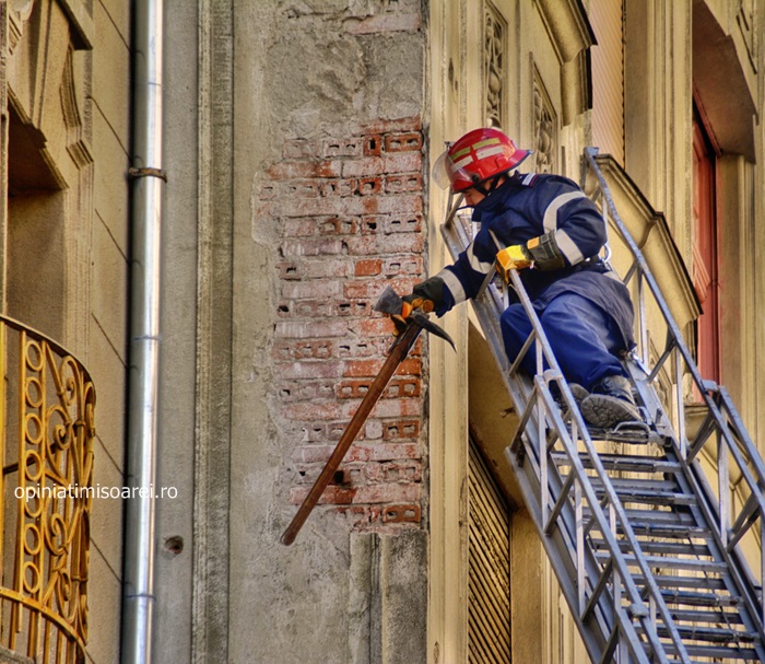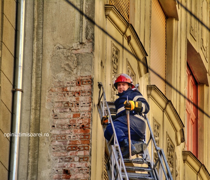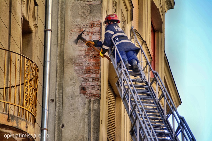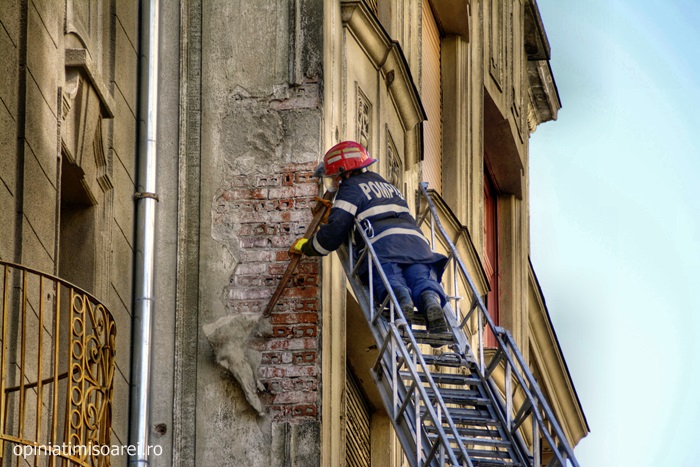TIMISOARA. Vantul puternic ce s-a abatut marti peste Timisoara a dat mari batai de cap pompierilor. Acestia au fost chemati sa intervina pentru a indeparta mai multe bucati de tencuiala care stateau sa se desprinda de pe fatada uneia dintre cladirile aflate in plin centrul orasului.