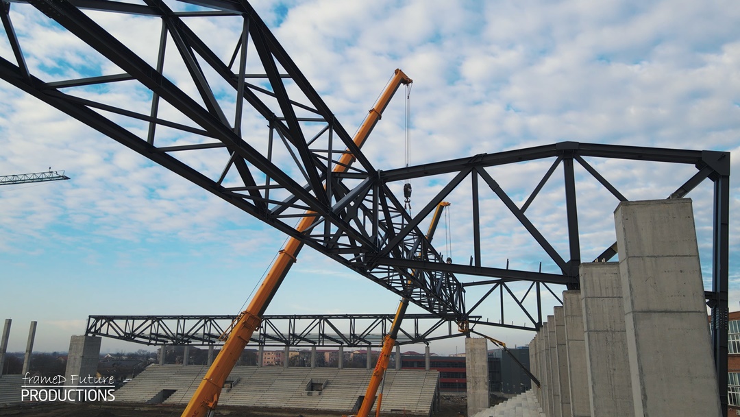De asemenea au fost realizate legături și cu cele două brațe metalice ridicate în spatele tribunei, pentru ca apoi să fie prinsă și de stâlpii de beton din spatele acesteia. După fixarea aceste grinde, pe ea va fi montat acoperișul.