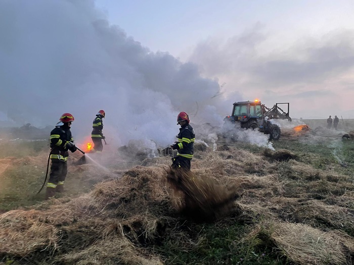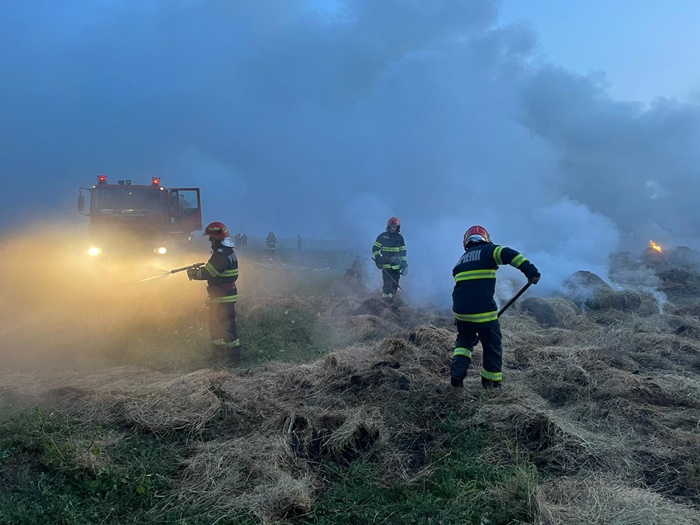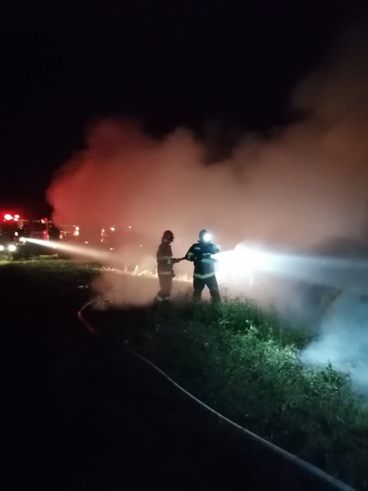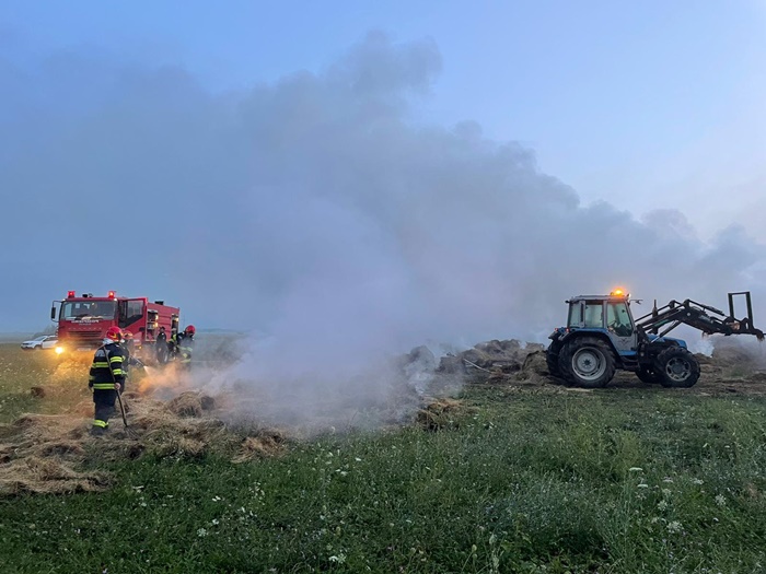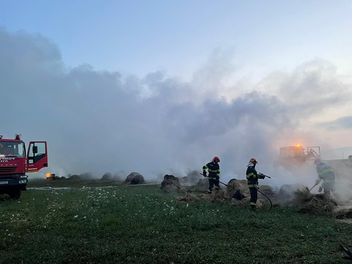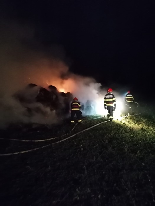 Salvatorii au muncit pana dupa ora 8.30 ca sa stinga flacarile. Acestea au mistuit 150 de baloti de fan a cate 500 kg fiecare.